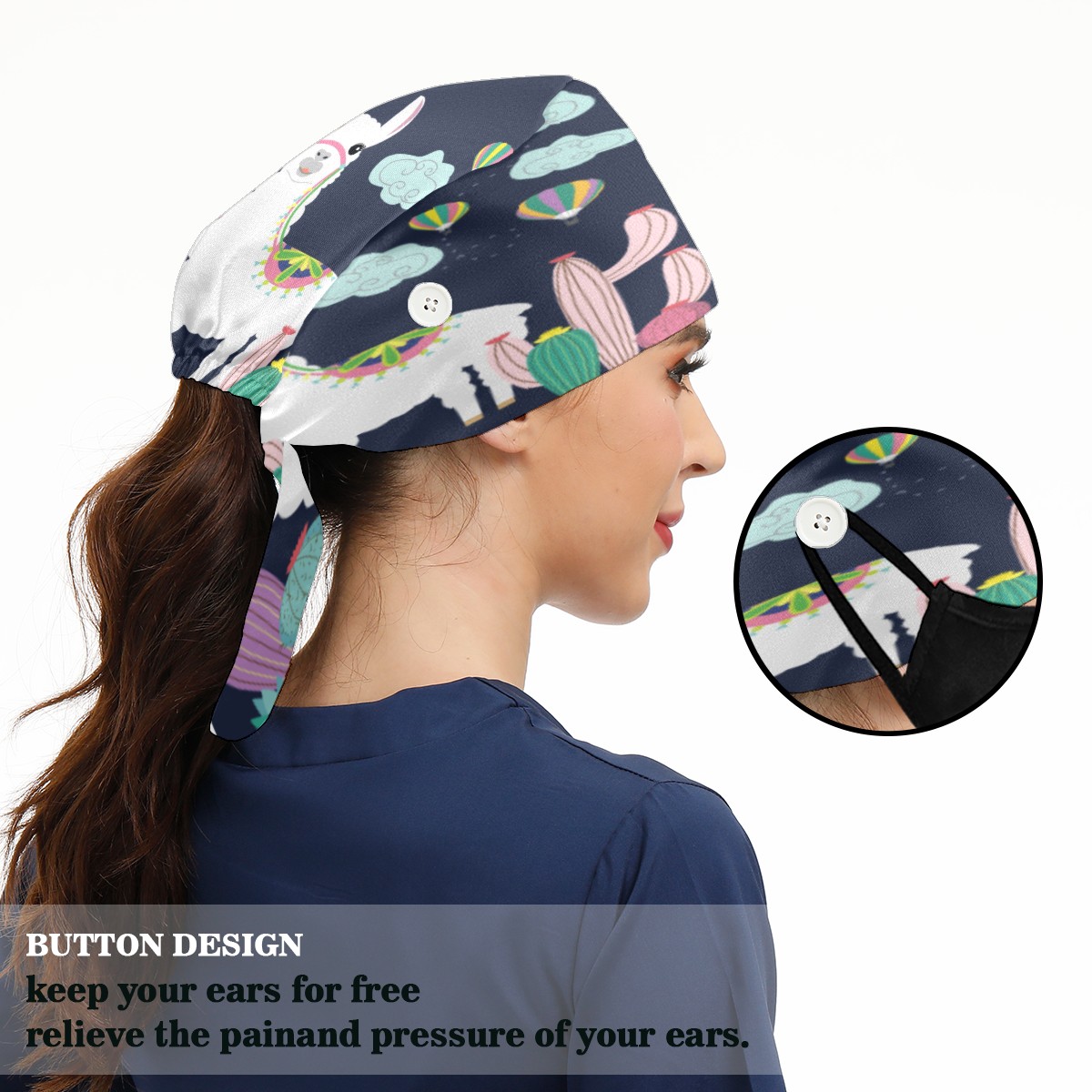 <p>Working cap with Sweatband and Button for Women Men</p><p>Material&nbsp;: 50% cotton+50% polyester</p><p>Size:&nbsp;One size fits most,&nbsp;suitable for both men and women.</p><p>Working Cap with Buttons Design:special&nbsp;design with buttons to protect ears for those who are wearing ma-sk. These new styles hats will allow you to put the straps around the buttons instead of your ears, make you feel more comfortable.</p><p>Sweat-absorbent towel cloth inside: Built-in&nbsp;100% cotton sweatband, keep the forehead clean after long time working.</p><p>Widely occasion: Widely used in beauty spa, house cleaning, cooking, sleeping, or for cos-play&nbsp;party.</p><p>Lovely pattern: lovely&nbsp;3D printed&nbsp;pattern,&nbsp;it's perfect for gift to you family&nbsp;and friends.</p>