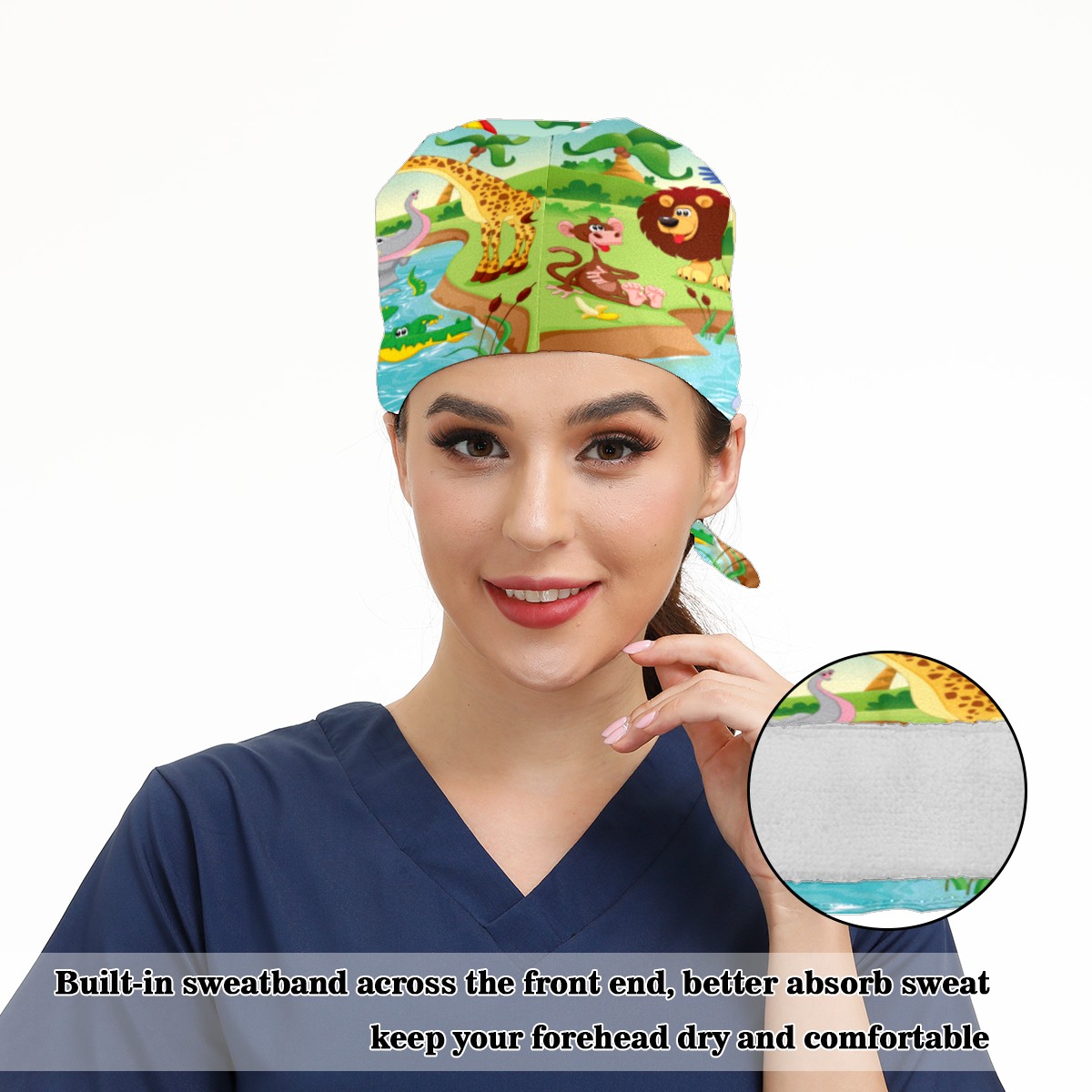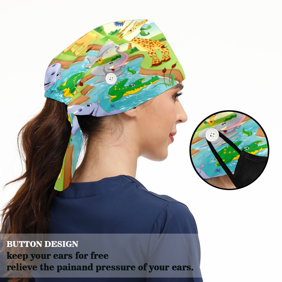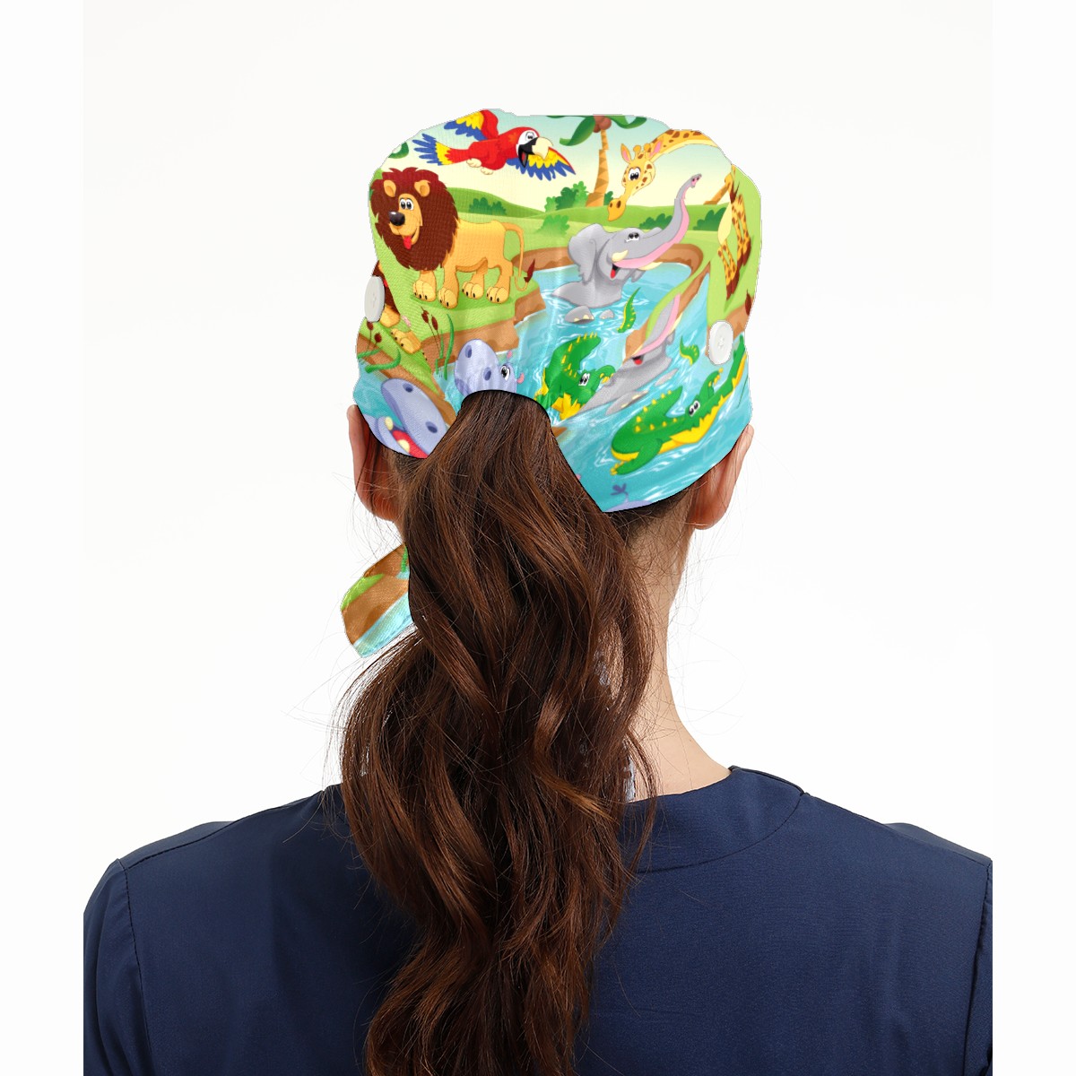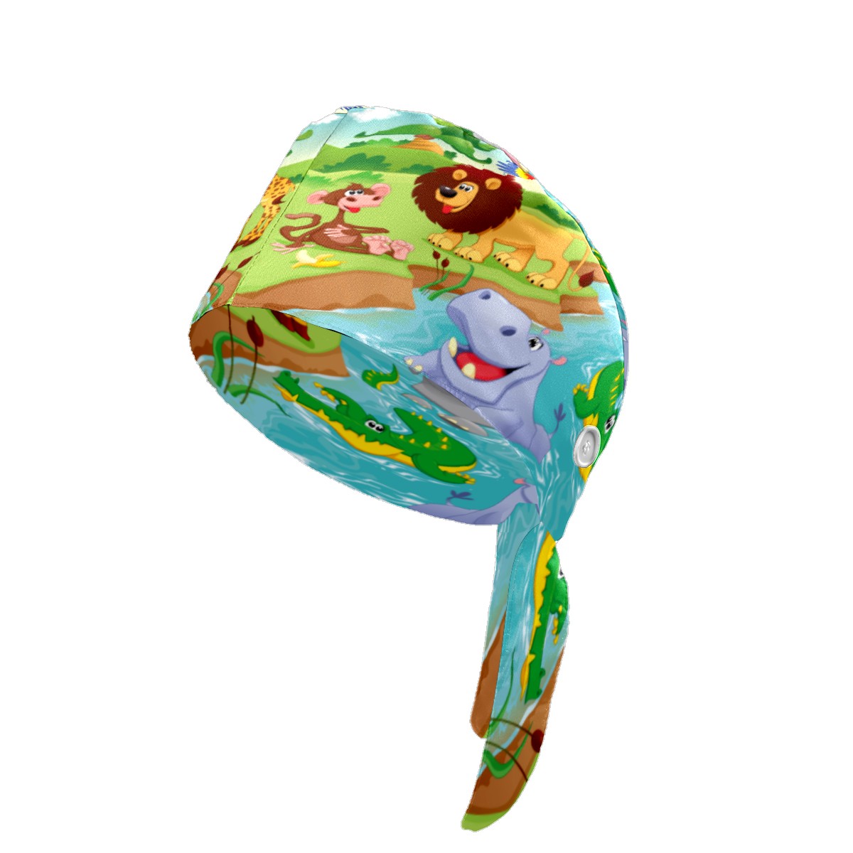 Giraffe Hippo Crocodile Lion Working Cap Button and Sweatband Adjustable Elastic Head Cover Hair Tie Back Work Hats for Women Men