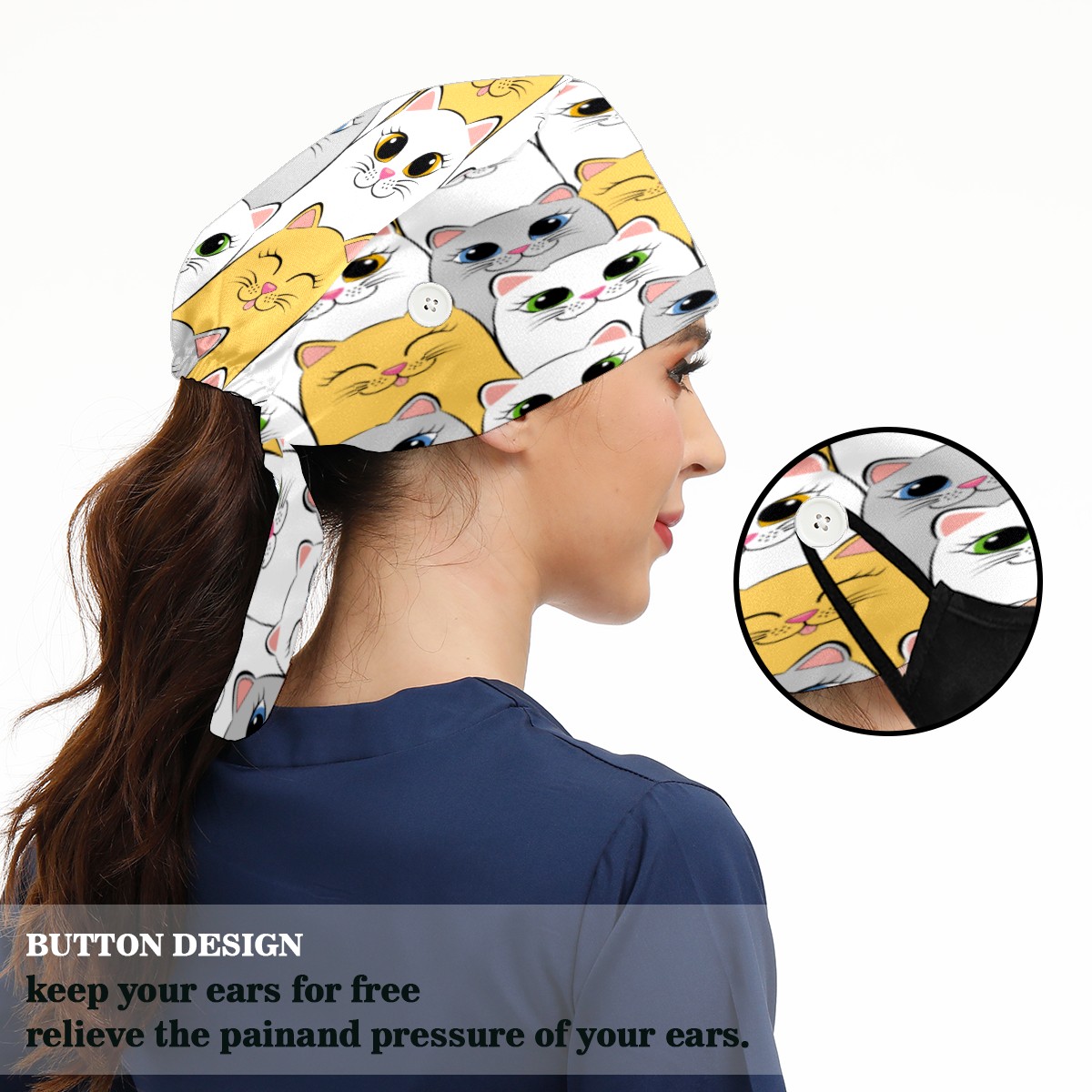 <p>Working cap with Sweatband and Button for Women Men</p><p>Material&nbsp;: 50% cotton+50% polyester</p><p>Size:&nbsp;One size fits most,&nbsp;suitable for both men and women.</p><p>Working Cap with Buttons Design:special&nbsp;design with buttons to protect ears for those who are wearing ma-sk. These new styles hats will allow you to put the straps around the buttons instead of your ears, make you feel more comfortable.</p><p>Sweat-absorbent towel cloth inside: Built-in&nbsp;100% cotton sweatband, keep the forehead clean after long time working.</p><p>Widely occasion: Widely used in beauty spa, house cleaning, cooking, sleeping, or for cos-play&nbsp;party.</p><p>Lovely pattern: lovely&nbsp;3D printed&nbsp;pattern,&nbsp;it's perfect for gift to you family&nbsp;and friends.</p>