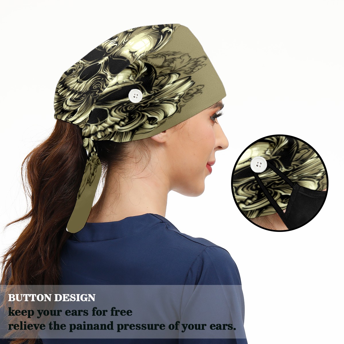 <p>Working cap with Sweatband and Button for Women Men</p><p>Material&nbsp;: 50% cotton+50% polyester</p><p>Size:&nbsp;One size fits most,&nbsp;suitable for both men and women.</p><p>Working Cap with Buttons Design:special&nbsp;design with buttons to protect ears for those who are wearing ma-sk. These new styles hats will allow you to put the straps around the buttons instead of your ears, make you feel more comfortable.</p><p>Sweat-absorbent towel cloth inside: Built-in&nbsp;100% cotton sweatband, keep the forehead clean after long time working.</p><p>Widely occasion: Widely used in beauty spa, house cleaning, cooking, sleeping, or for cos-play&nbsp;party.</p><p>Lovely pattern: lovely&nbsp;3D printed&nbsp;pattern,&nbsp;it's perfect for gift to you family&nbsp;and friends.</p>