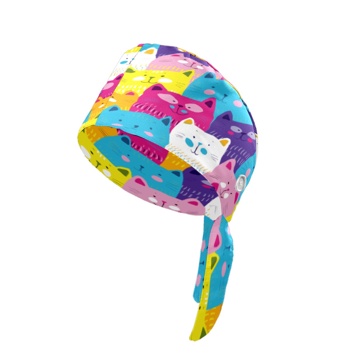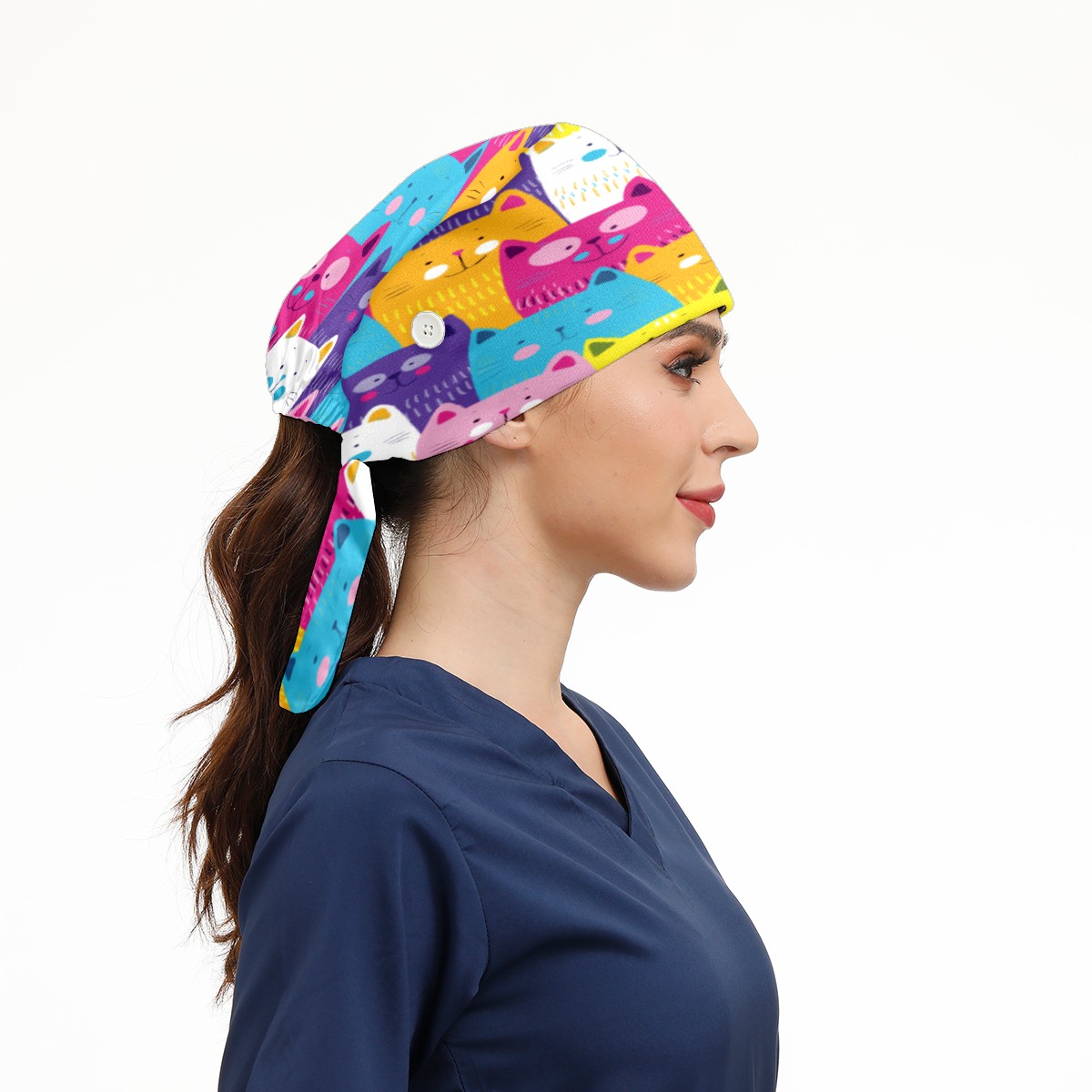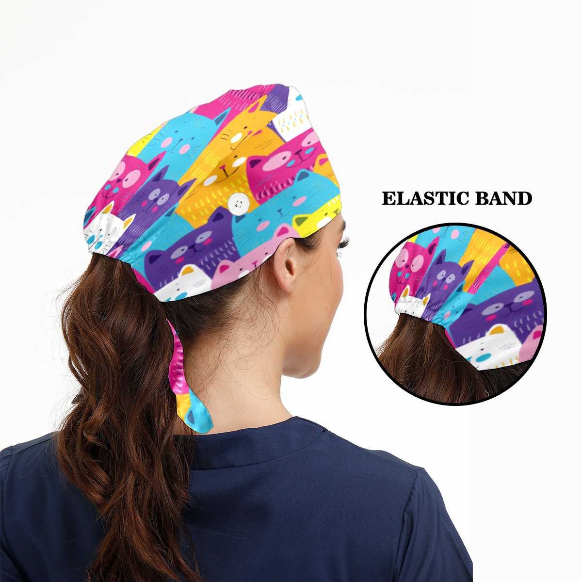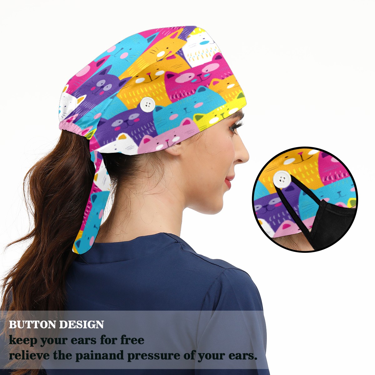 Cute Cartoon Colorful Cats Kitty Working Cap Button and Sweatband Adjustable Elastic Head Cover Hair Tie Back Work Hats for Women Men