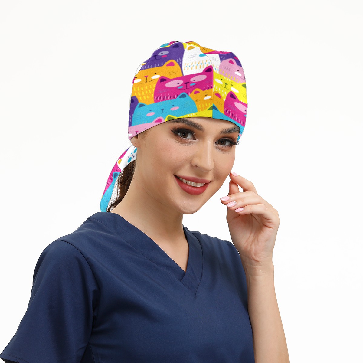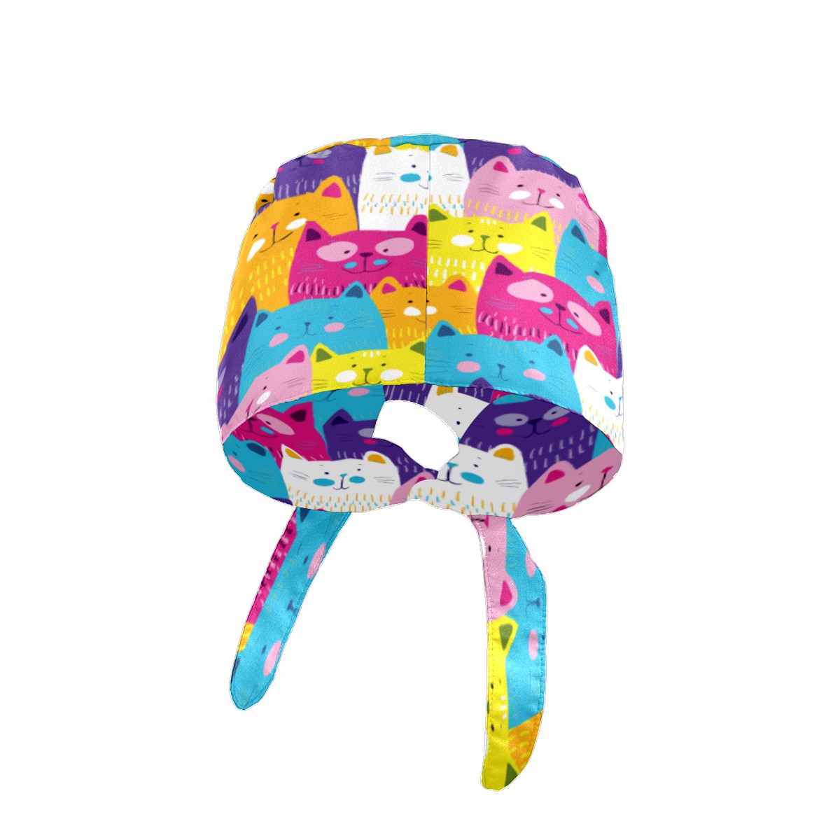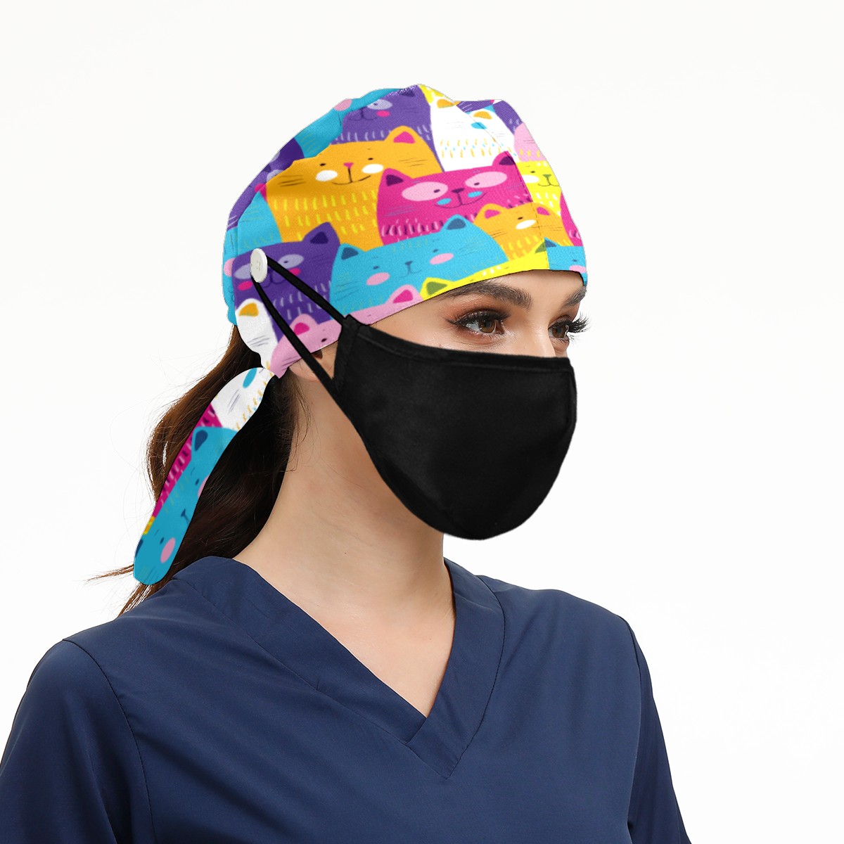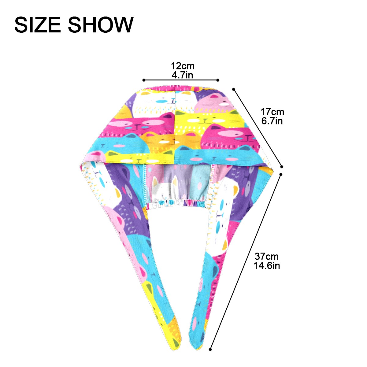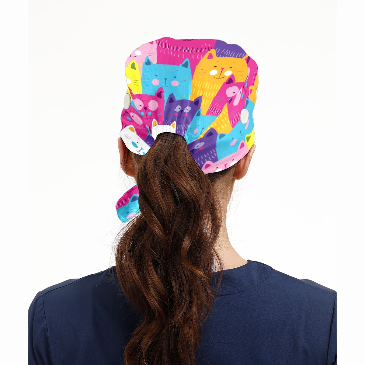 Cute Cartoon Colorful Cats Kitty Working Cap Button and Sweatband Adjustable Elastic Head Cover Hair Tie Back Work Hats for Women Men
