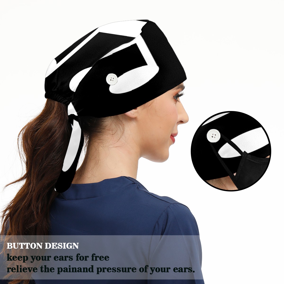 <p>Working cap with Sweatband and Button for Women Men</p><p>Material&nbsp;: 50% cotton+50% polyester</p><p>Size:&nbsp;One size fits most,&nbsp;suitable for both men and women.</p><p>Working Cap with Buttons Design:special&nbsp;design with buttons to protect ears for those who are wearing ma-sk. These new styles hats will allow you to put the straps around the buttons instead of your ears, make you feel more comfortable.</p><p>Sweat-absorbent towel cloth inside: Built-in&nbsp;100% cotton sweatband, keep the forehead clean after long time working.</p><p>Widely occasion: Widely used in beauty spa, house cleaning, cooking, sleeping, or for cos-play&nbsp;party.</p><p>Lovely pattern: lovely&nbsp;3D printed&nbsp;pattern,&nbsp;it's perfect for gift to you family&nbsp;and friends.</p>