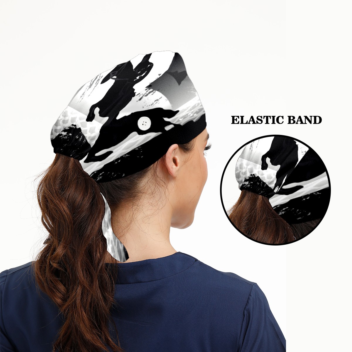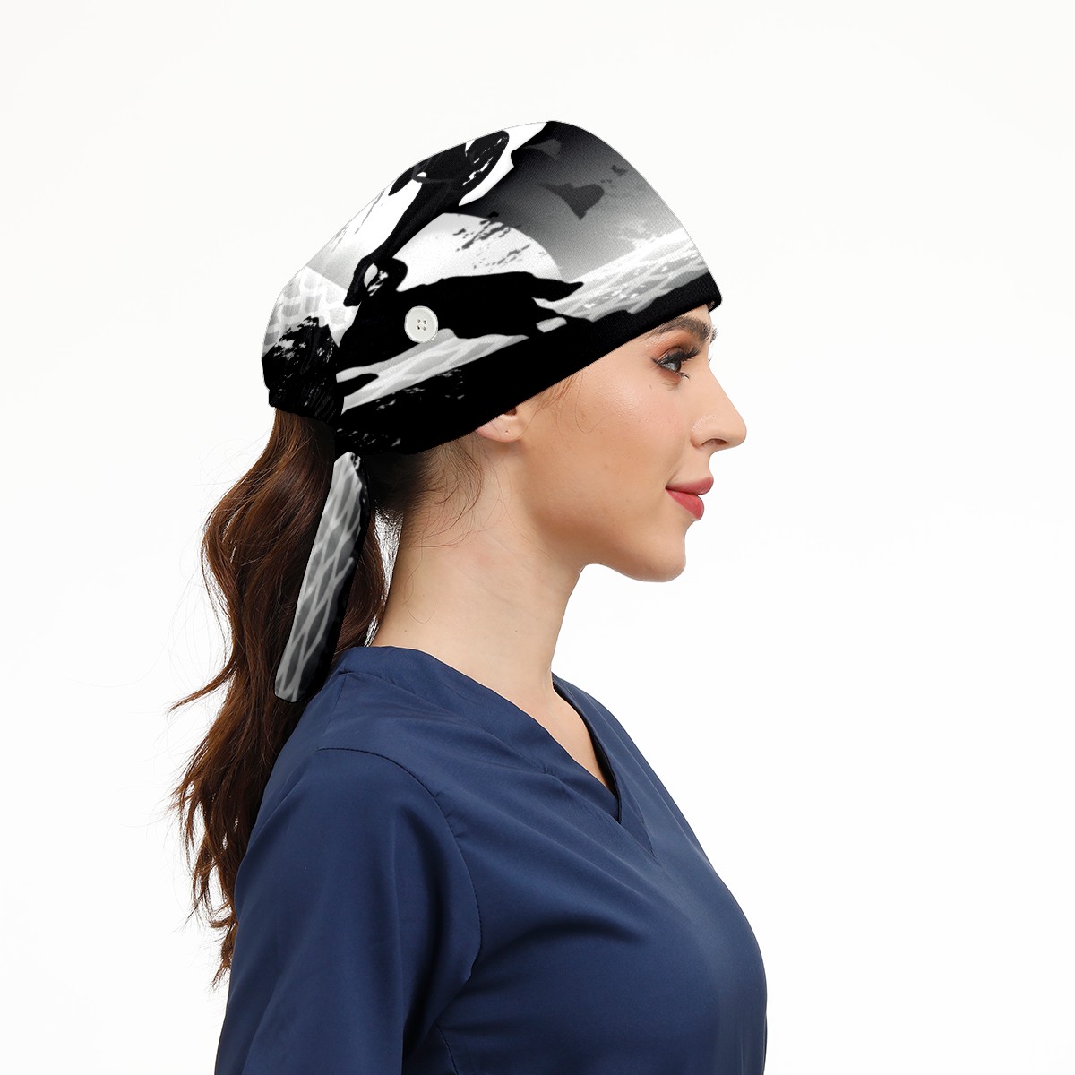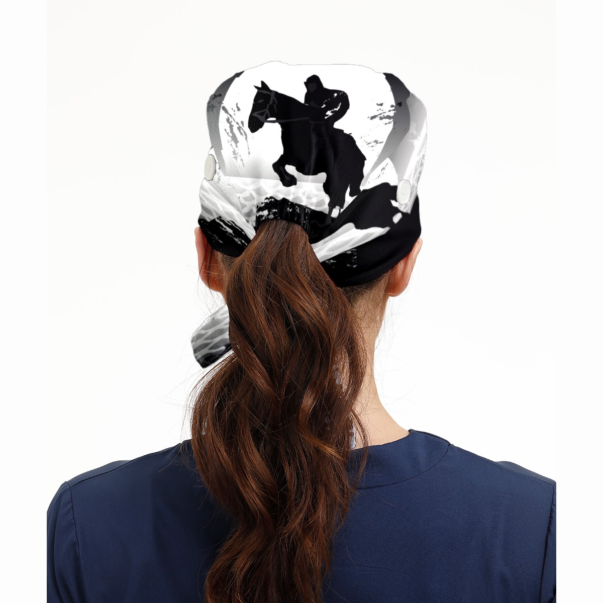 Black White Horse And Rider Night Moon Working Cap Button and Sweatband Adjustable Elastic Head Cover Hair Tie Back Work Hats for Women Men