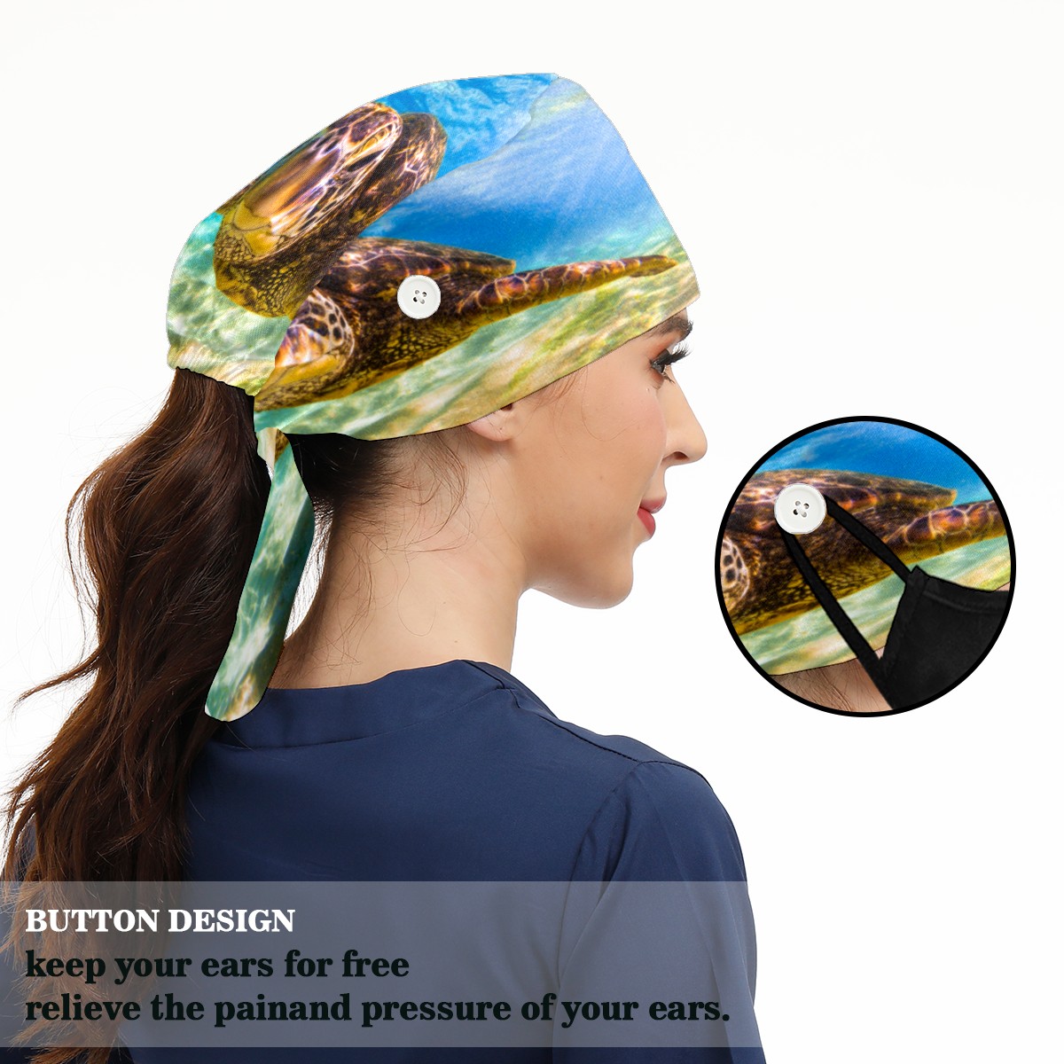 <p>Working cap with Sweatband and Button for Women Men</p><p>Material&nbsp;: 50% cotton+50% polyester</p><p>Size:&nbsp;One size fits most,&nbsp;suitable for both men and women.</p><p>Working Cap with Buttons Design:special&nbsp;design with buttons to protect ears for those who are wearing ma-sk. These new styles hats will allow you to put the straps around the buttons instead of your ears, make you feel more comfortable.</p><p>Sweat-absorbent towel cloth inside: Built-in&nbsp;100% cotton sweatband, keep the forehead clean after long time working.</p><p>Widely occasion: Widely used in beauty spa, house cleaning, cooking, sleeping, or for cos-play&nbsp;party.</p><p>Lovely pattern: lovely&nbsp;3D printed&nbsp;pattern,&nbsp;it's perfect for gift to you family&nbsp;and friends.</p>