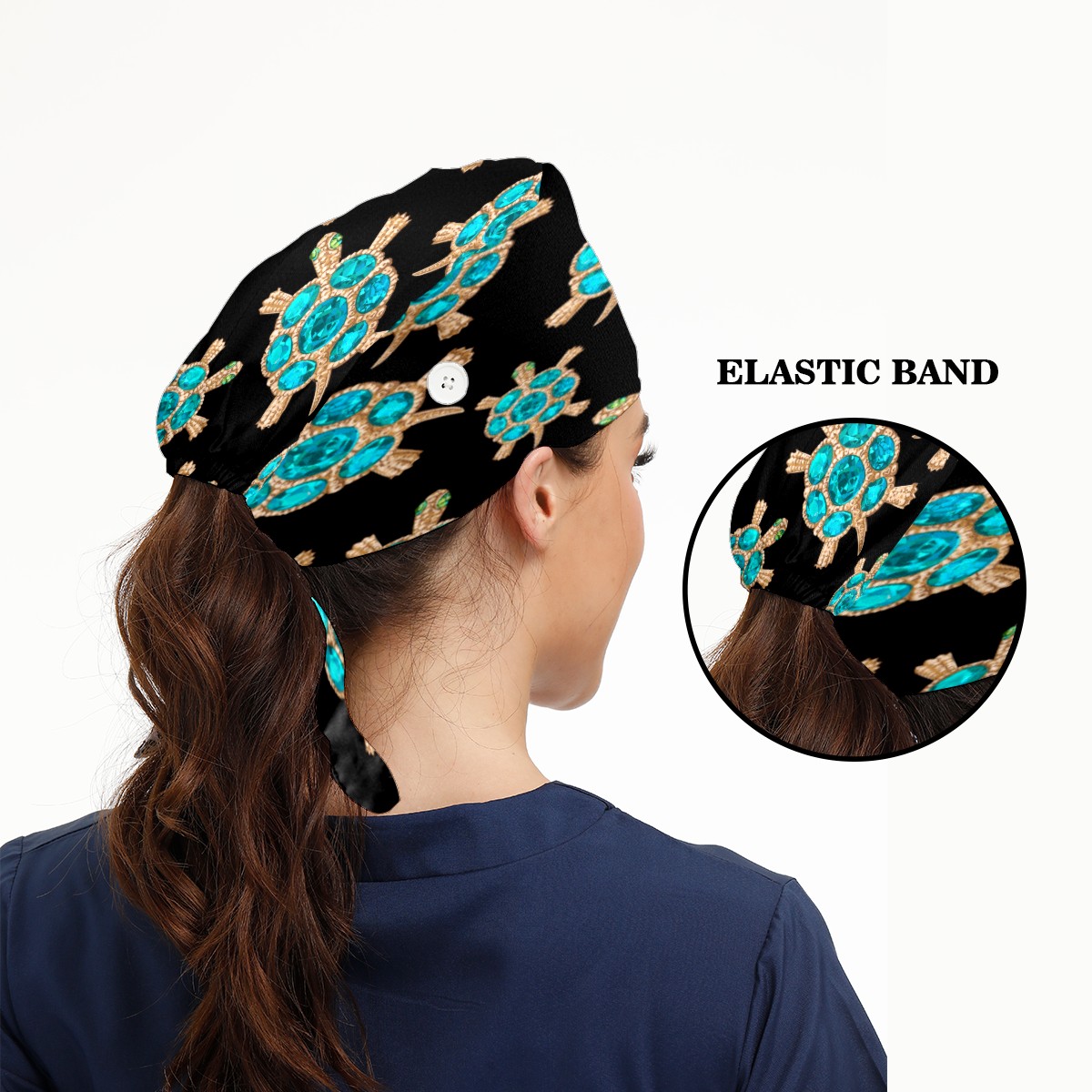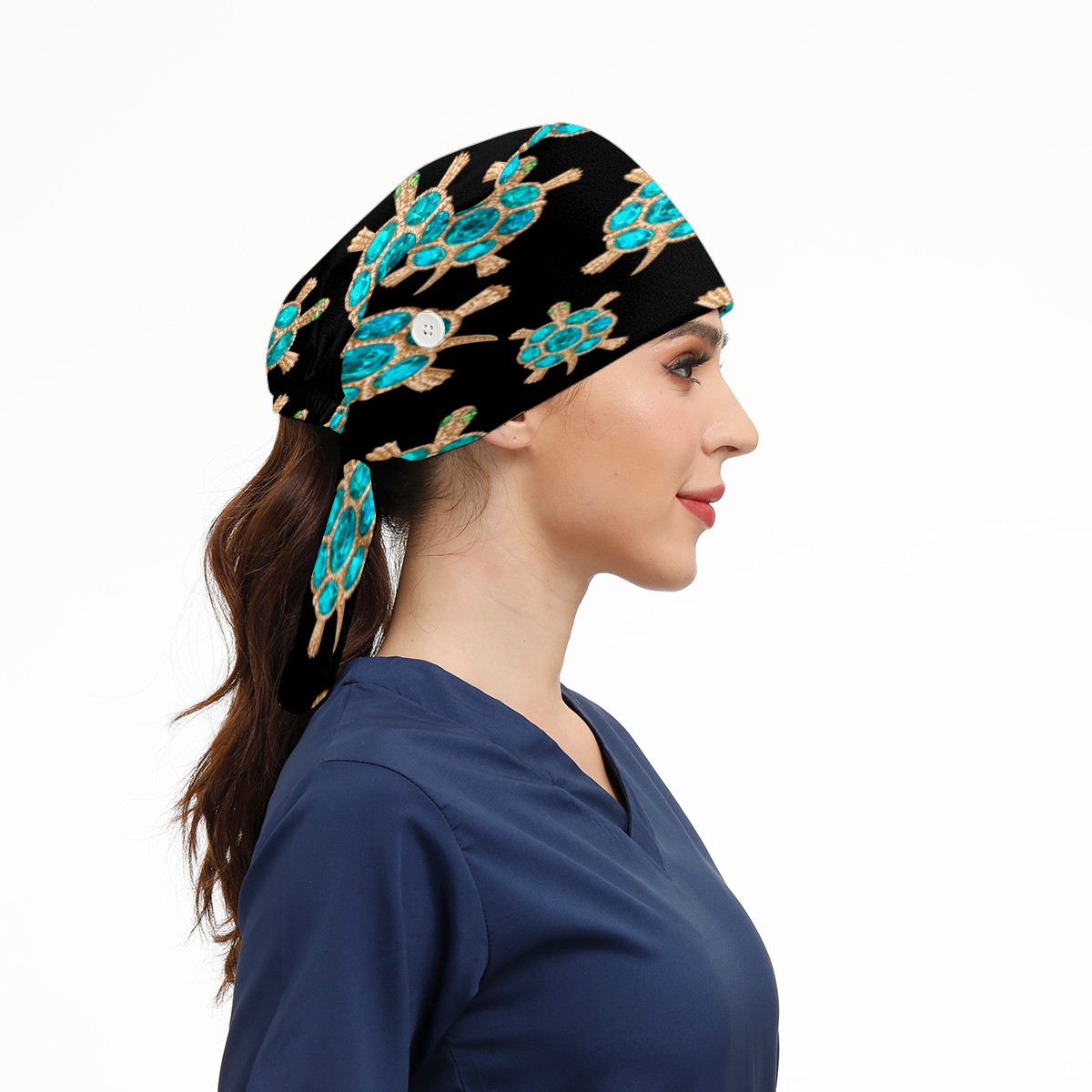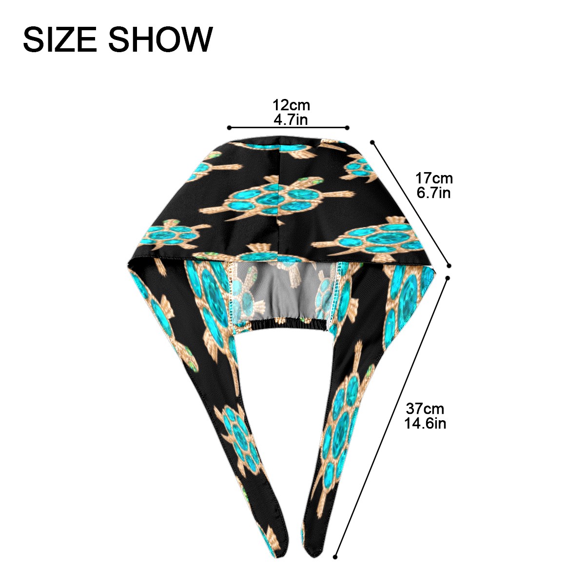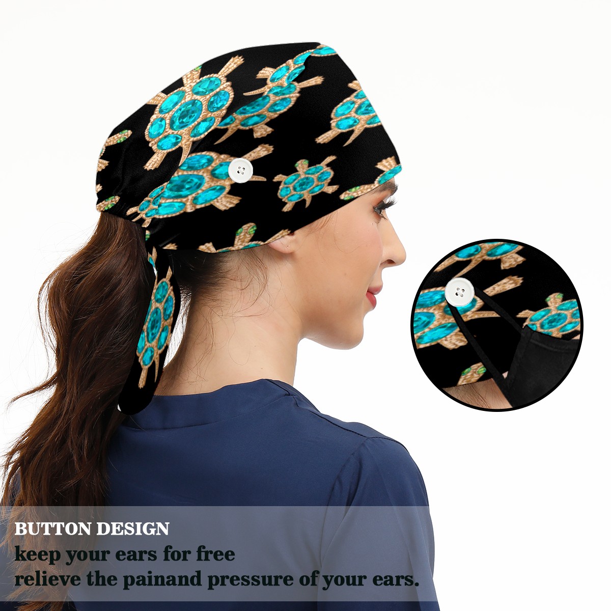 Boho Sea Turtle With Blue Diamond Working Cap Button and Sweatband Adjustable Elastic Head Cover Hair Tie Back Work Hats for Women Men
