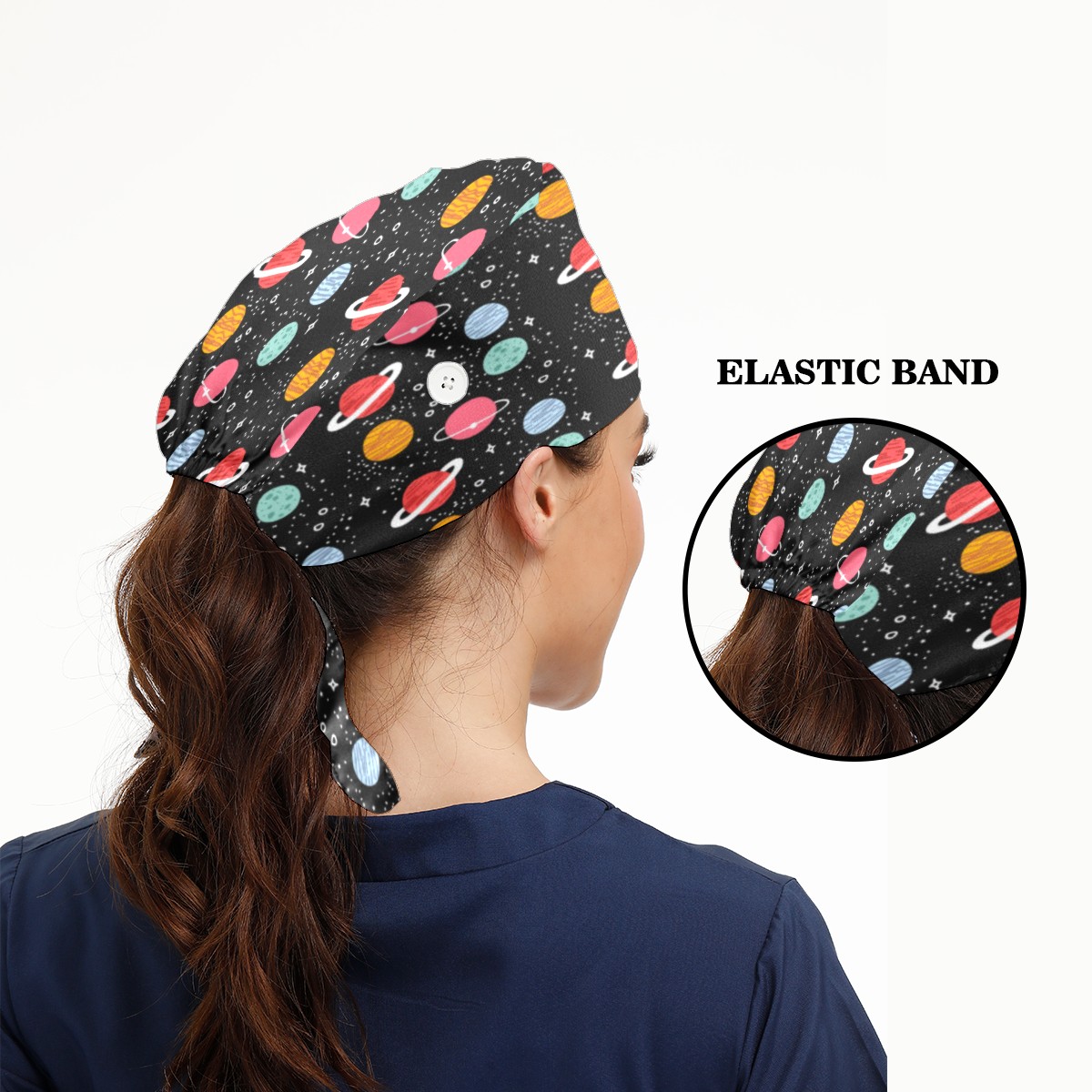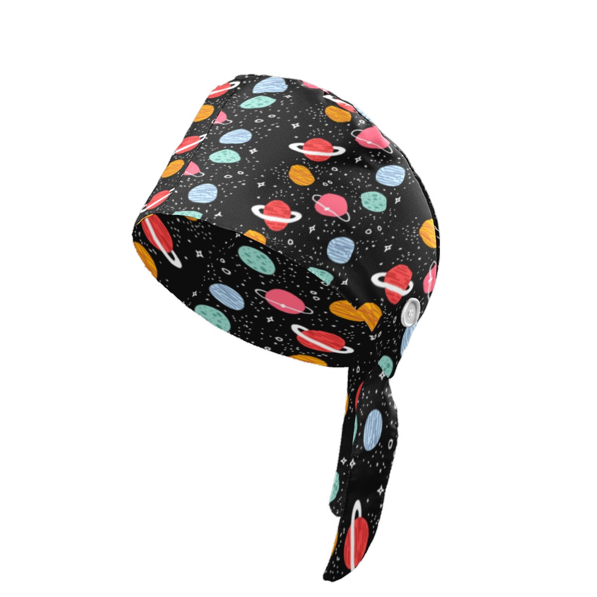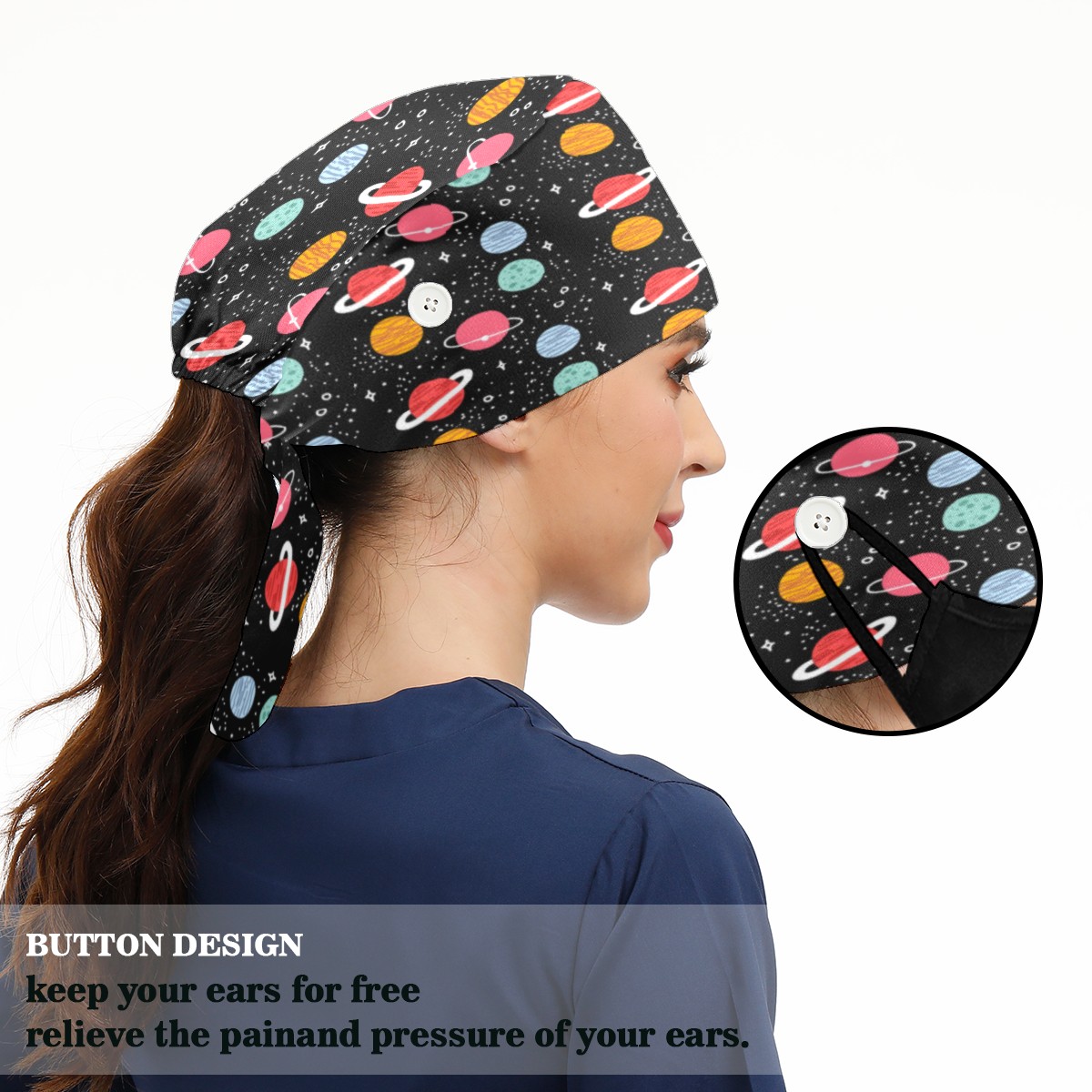 Cute Cartoon Space Planets Working Cap Button and Sweatband Adjustable Elastic Head Cover Hair Tie Back Work Hats for Women Men