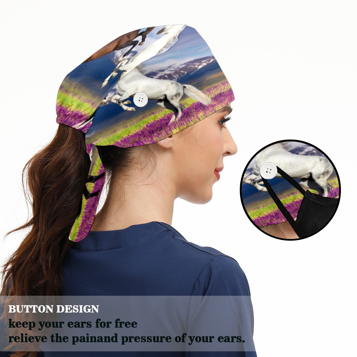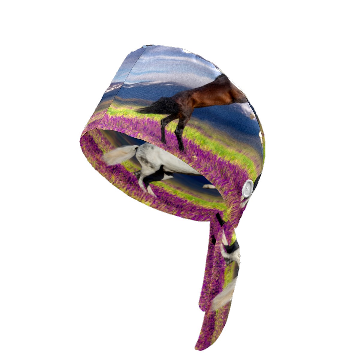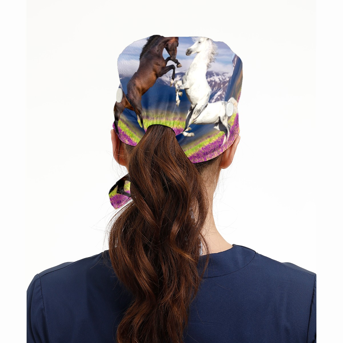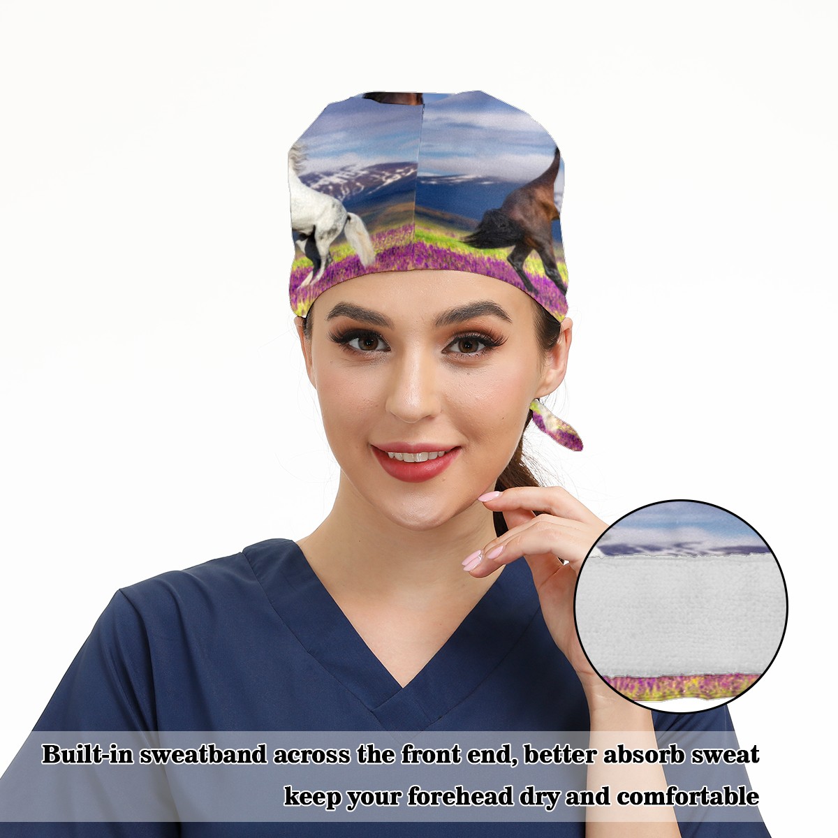 Two Horses Fighting Mountain Flowers Field Working Cap Button and Sweatband Adjustable Elastic Head Cover Hair Tie Back Work Hats for Women Men
