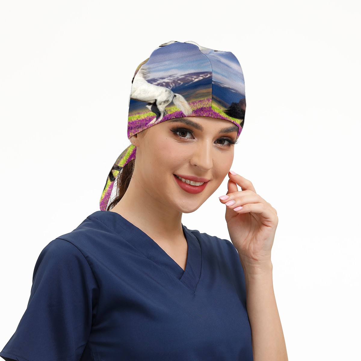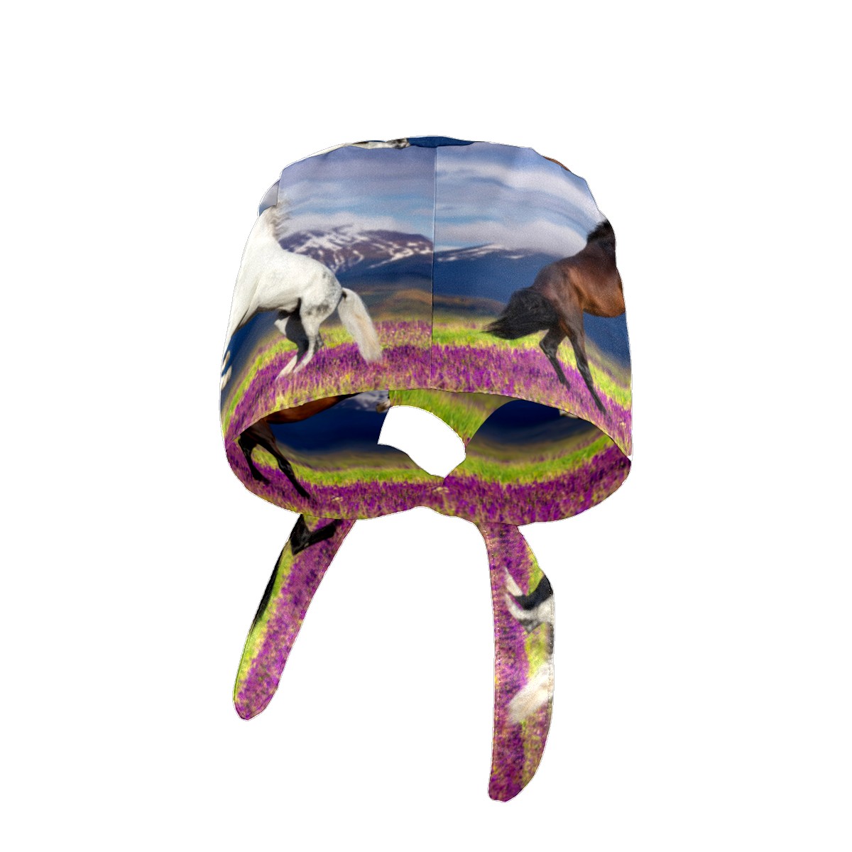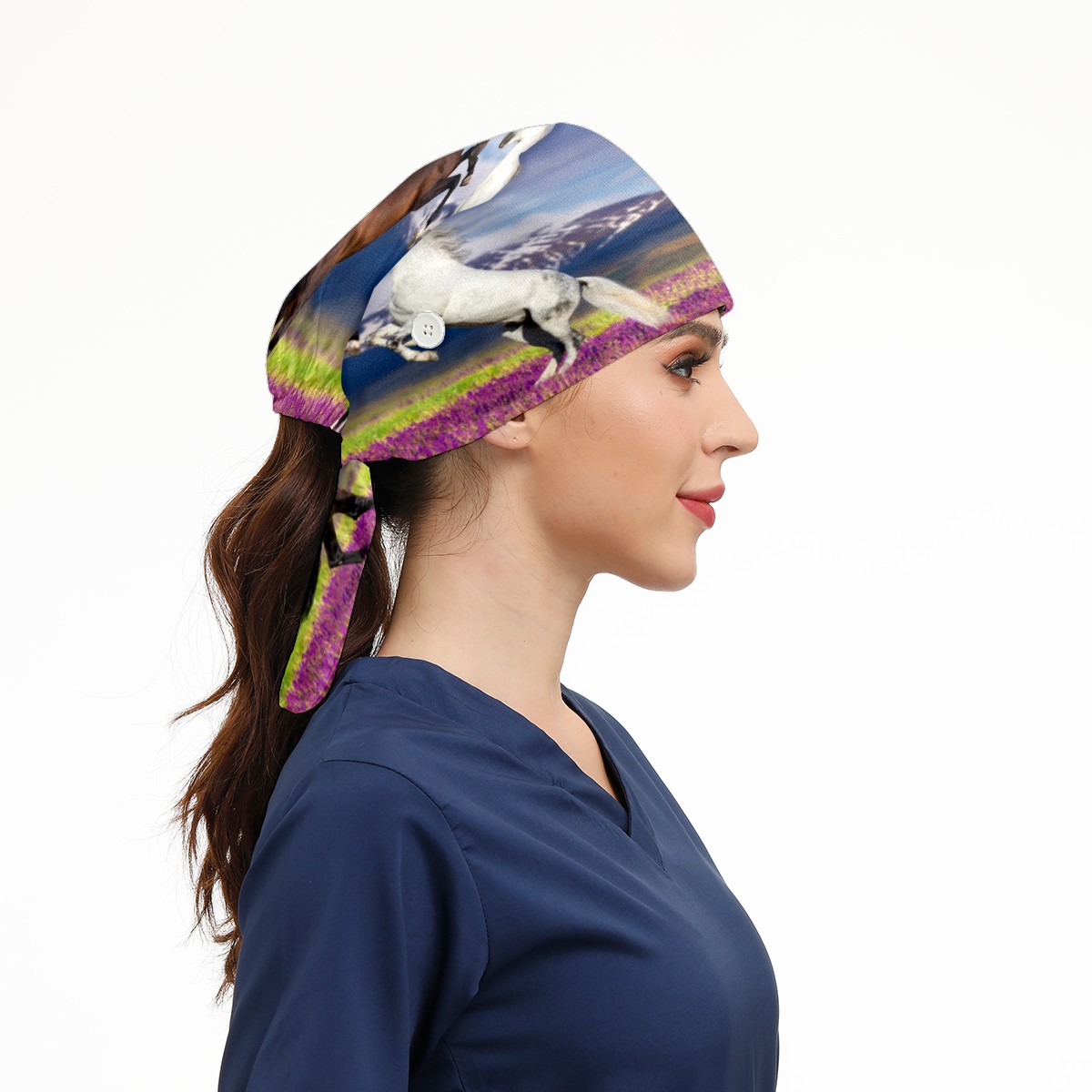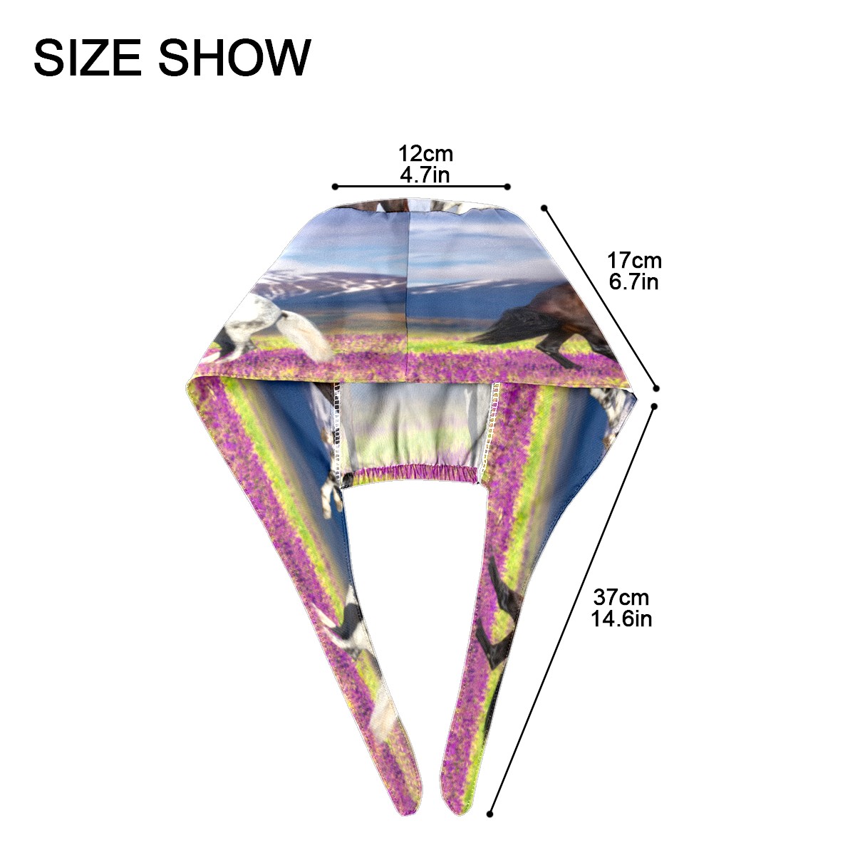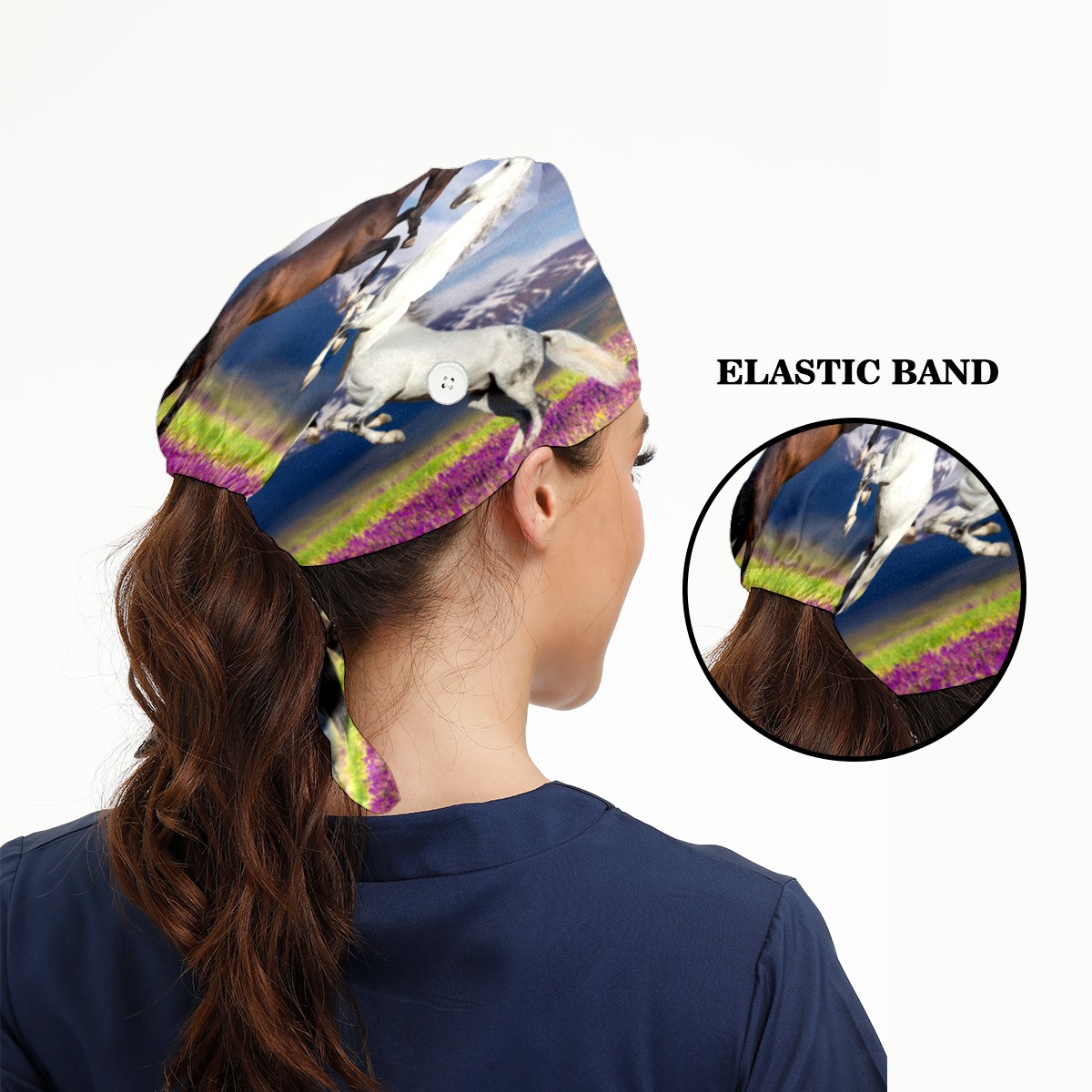 Two Horses Fighting Mountain Flowers Field Working Cap Button and Sweatband Adjustable Elastic Head Cover Hair Tie Back Work Hats for Women Men