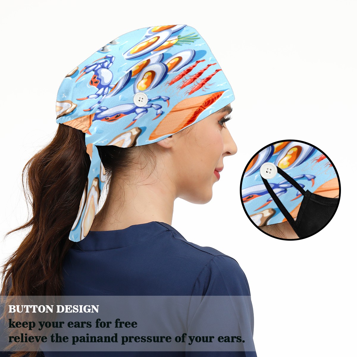 <p>Working cap with Sweatband and Button for Women Men</p><p>Material&nbsp;: 50% cotton+50% polyester</p><p>Size:&nbsp;One size fits most,&nbsp;suitable for both men and women.</p><p>Working Cap with Buttons Design:special&nbsp;design with buttons to protect ears for those who are wearing ma-sk. These new styles hats will allow you to put the straps around the buttons instead of your ears, make you feel more comfortable.</p><p>Sweat-absorbent towel cloth inside: Built-in&nbsp;100% cotton sweatband, keep the forehead clean after long time working.</p><p>Widely occasion: Widely used in beauty spa, house cleaning, cooking, sleeping, or for cos-play&nbsp;party.</p><p>Lovely pattern: lovely&nbsp;3D printed&nbsp;pattern,&nbsp;it's perfect for gift to you family&nbsp;and friends.</p>