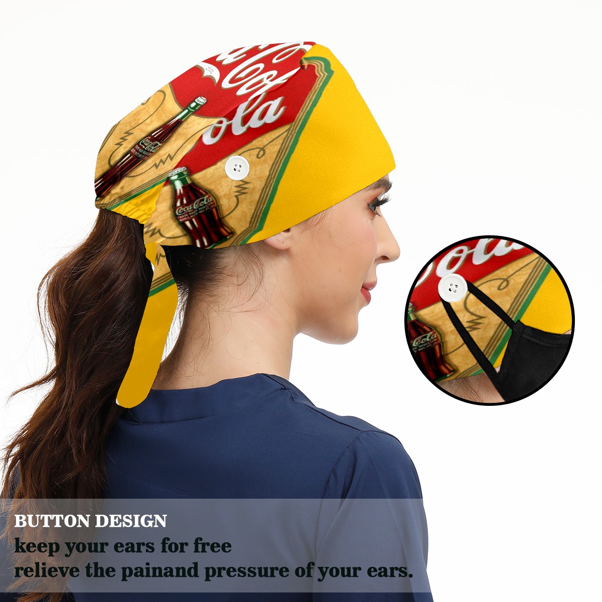 <p>Women and Mens head cover with Sweatband and Button</p><p>Material&nbsp;: 50% cotton+50% polyester</p><p>Size:&nbsp;One size fits most,&nbsp;suitable for both men and women.</p><p>Working Cap with Buttons Design:special&nbsp;design with buttons to protect ears for those who are wearing ma-sk. These new styles hats will allow you to put the straps around the buttons instead of your ears, make you feel more comfortable.</p><p>Sweat-absorbent towel cloth inside: Built-in&nbsp;100% cotton sweatband, keep the forehead clean after long time working.</p><p>Widely occasion: Widely used in beauty spa, house cleaning, cooking, sleeping, or for cos-play&nbsp;party.</p><p>Lovely pattern: lovely&nbsp;3D printed&nbsp;pattern,&nbsp;it's perfect for gift to you family&nbsp;and friends.</p>