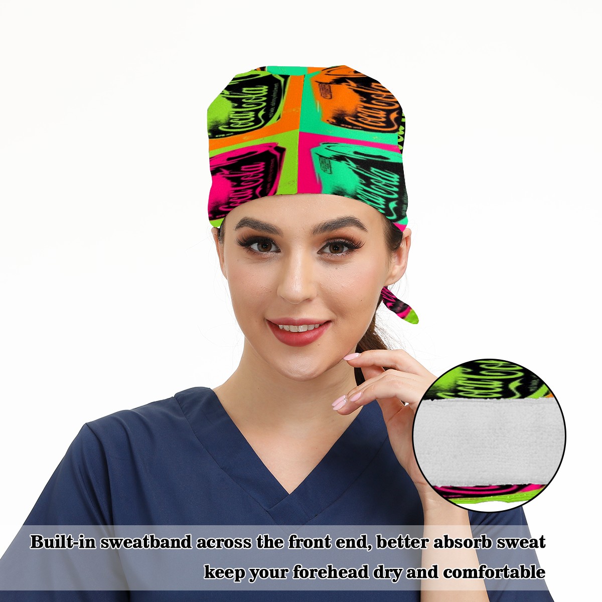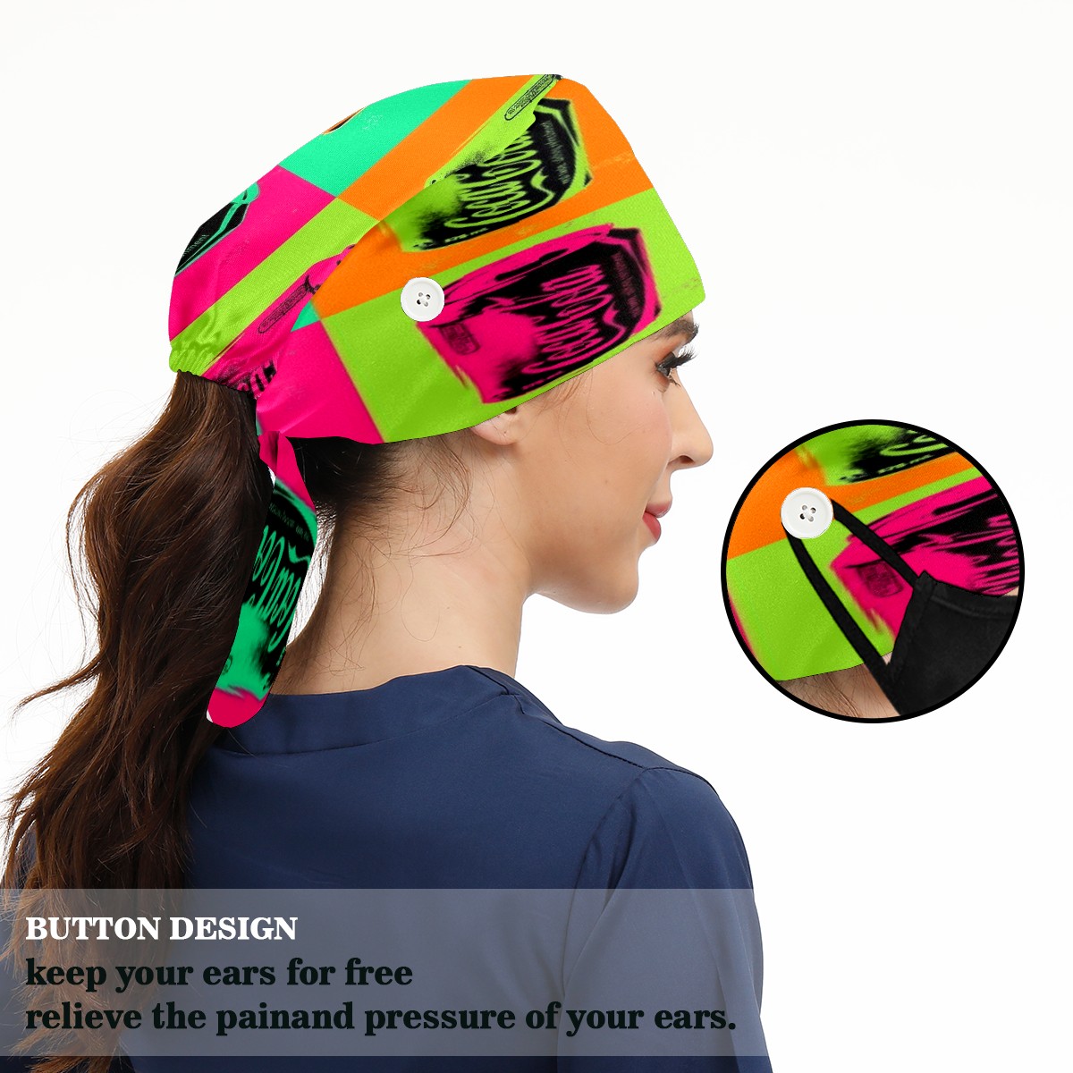 <p>Women and Mens head cover with Sweatband and Button</p><p>Material&nbsp;: 50% cotton+50% polyester</p><p>Size:&nbsp;One size fits most,&nbsp;suitable for both men and women.</p><p>Working Cap with Buttons Design:special&nbsp;design with buttons to protect ears for those who are wearing ma-sk. These new styles hats will allow you to put the straps around the buttons instead of your ears, make you feel more comfortable.</p><p>Sweat-absorbent towel cloth inside: Built-in&nbsp;100% cotton sweatband, keep the forehead clean after long time working.</p><p>Widely occasion: Widely used in beauty spa, house cleaning, cooking, sleeping, or for cos-play&nbsp;party.</p><p>Lovely pattern: lovely&nbsp;3D printed&nbsp;pattern,&nbsp;it's perfect for gift to you family&nbsp;and friends.</p>