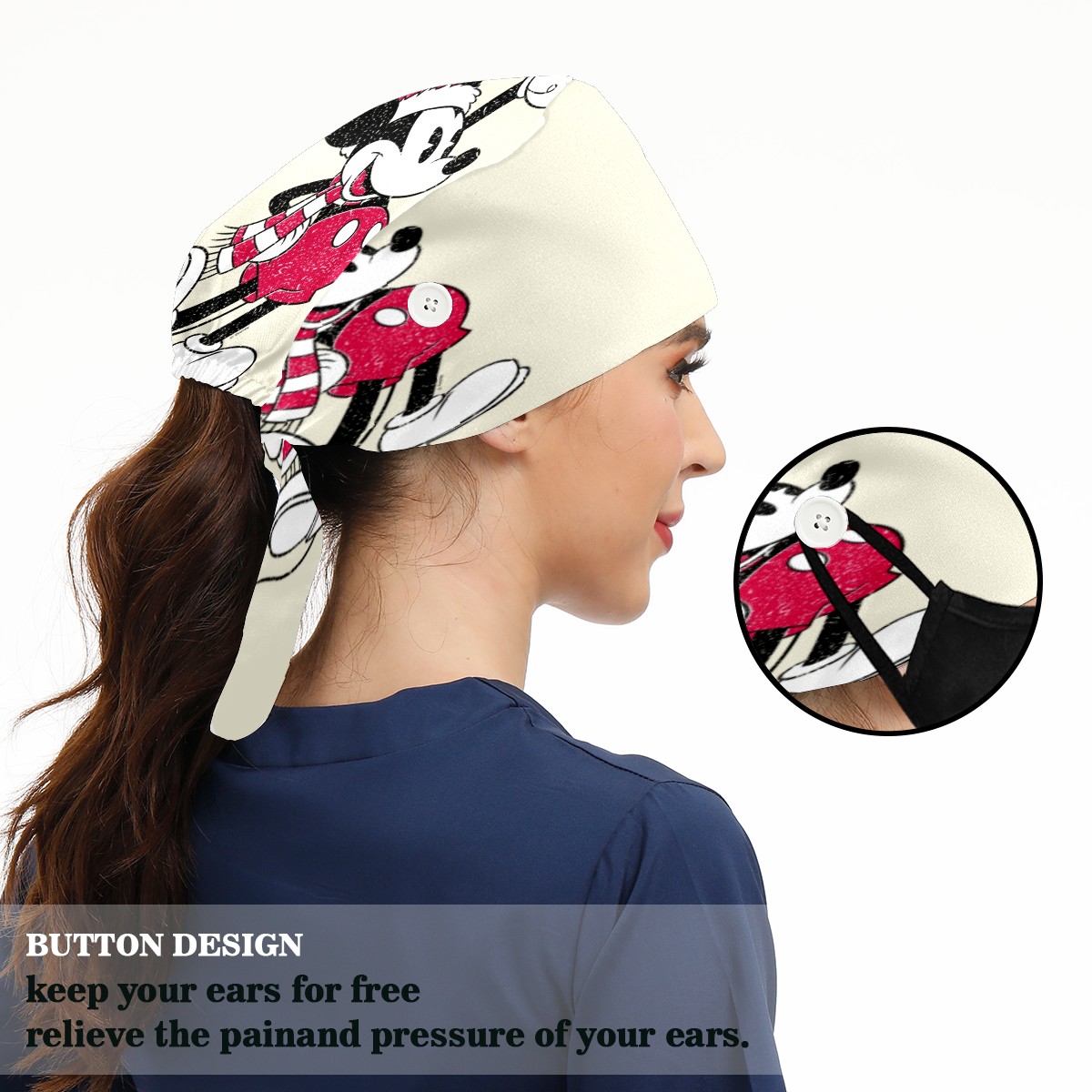 <p>Women and Mens head cover with Sweatband and Button</p><p>Material&nbsp;: 50% cotton+50% polyester</p><p>Size:&nbsp;One size fits most,&nbsp;suitable for both men and women.</p><p>Working Cap with Buttons Design:special&nbsp;design with buttons to protect ears for those who are wearing ma-sk. These new styles hats will allow you to put the straps around the buttons instead of your ears, make you feel more comfortable.</p><p>Sweat-absorbent towel cloth inside: Built-in&nbsp;100% cotton sweatband, keep the forehead clean after long time working.</p><p>Widely occasion: Widely used in beauty spa, house cleaning, cooking, sleeping, or for cos-play&nbsp;party.</p><p>Lovely pattern: lovely&nbsp;3D printed&nbsp;pattern,&nbsp;it's perfect for gift to you family&nbsp;and friends.</p>