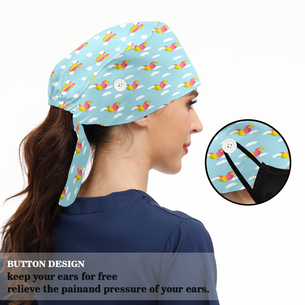 <p>Women and Mens head cover with Sweatband and Button</p><p>Material&nbsp;: 50% cotton+50% polyester</p><p>Size:&nbsp;One size fits most,&nbsp;suitable for both men and women.</p><p>Working Cap with Buttons Design:special&nbsp;design with buttons to protect ears for those who are wearing ma-sk. These new styles hats will allow you to put the straps around the buttons instead of your ears, make you feel more comfortable.</p><p>Sweat-absorbent towel cloth inside: Built-in&nbsp;100% cotton sweatband, keep the forehead clean after long time working.</p><p>Widely occasion: Widely used in beauty spa, house cleaning, cooking, sleeping, or for cos-play&nbsp;party.</p><p>Lovely pattern: lovely&nbsp;3D printed&nbsp;pattern,&nbsp;it's perfect for gift to you family&nbsp;and friends.</p>