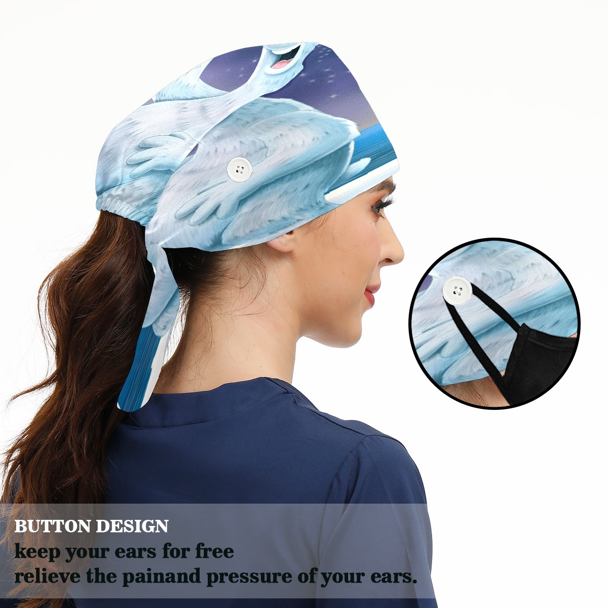<p>Women and Mens head cover with Sweatband and Button</p><p>Material&nbsp;: 50% cotton+50% polyester</p><p>Size:&nbsp;One size fits most,&nbsp;suitable for both men and women.</p><p>Working Cap with Buttons Design:special&nbsp;design with buttons to protect ears for those who are wearing ma-sk. These new styles hats will allow you to put the straps around the buttons instead of your ears, make you feel more comfortable.</p><p>Sweat-absorbent towel cloth inside: Built-in&nbsp;100% cotton sweatband, keep the forehead clean after long time working.</p><p>Widely occasion: Widely used in beauty spa, house cleaning, cooking, sleeping, or for cos-play&nbsp;party.</p><p>Lovely pattern: lovely&nbsp;3D printed&nbsp;pattern,&nbsp;it's perfect for gift to you family&nbsp;and friends.</p>
