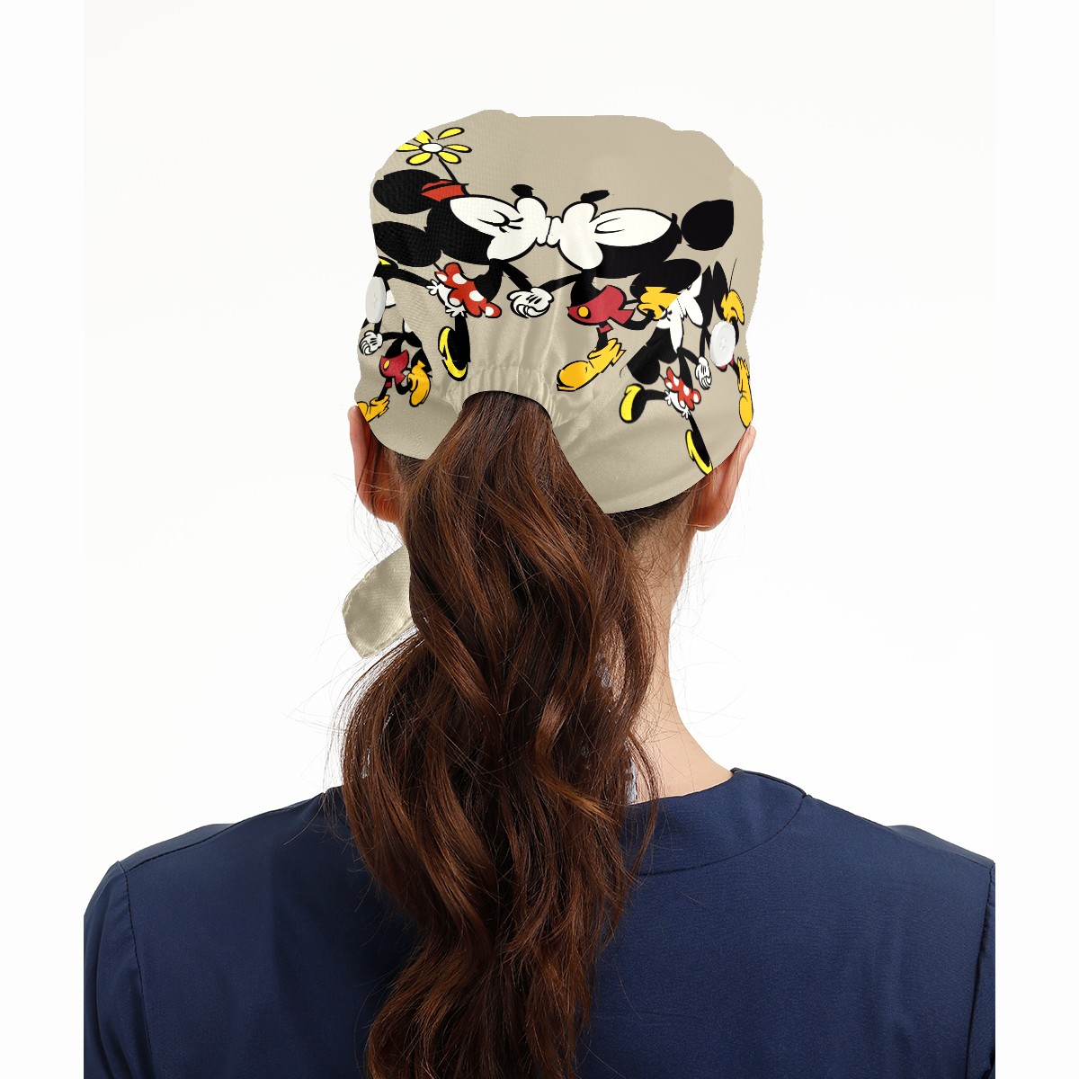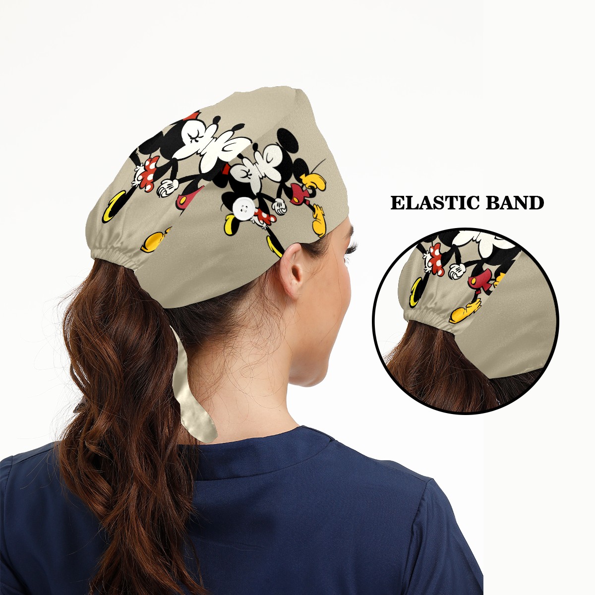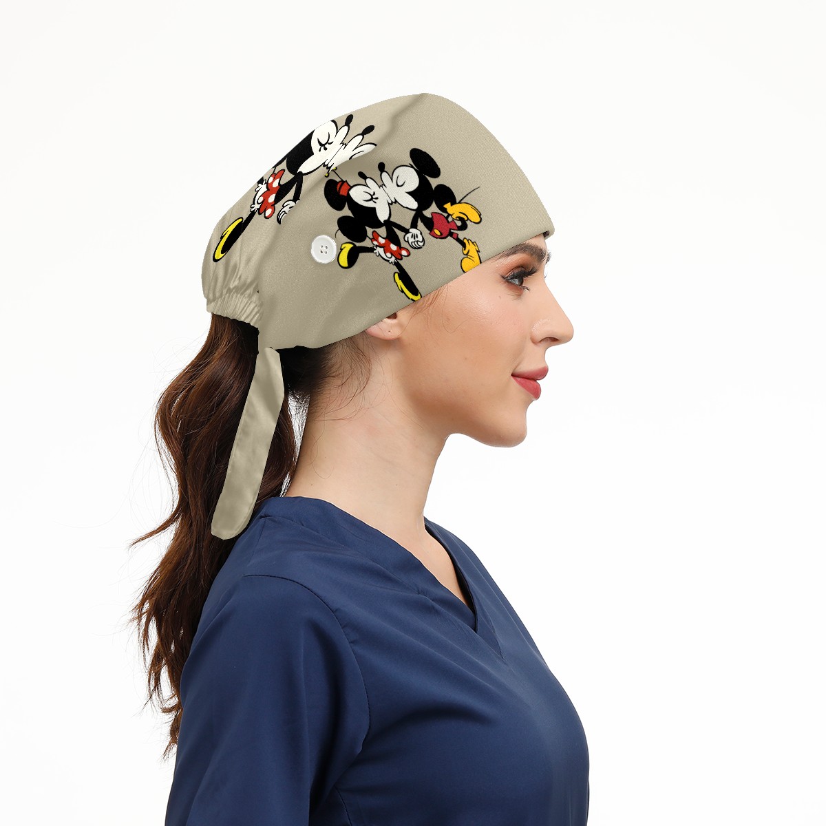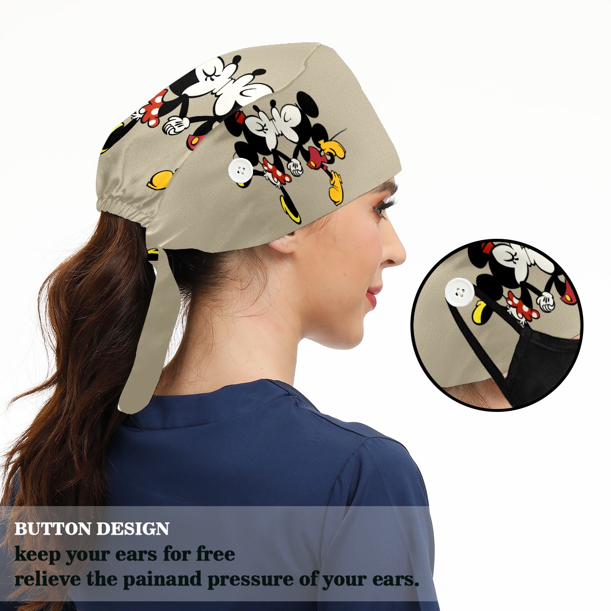 Fashion Working Cap Button and Sweatband Adjustable Elastic Cartoon Minnie Kissing Mickey Mouse Head Cover Hair Tie Back Work Hats for Women Men
