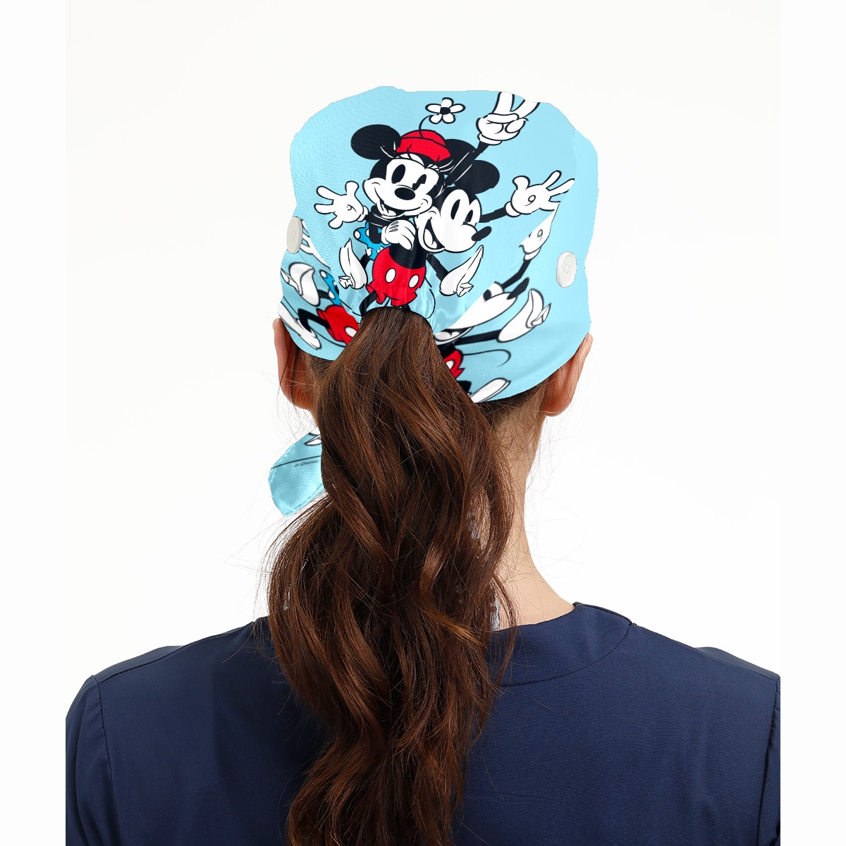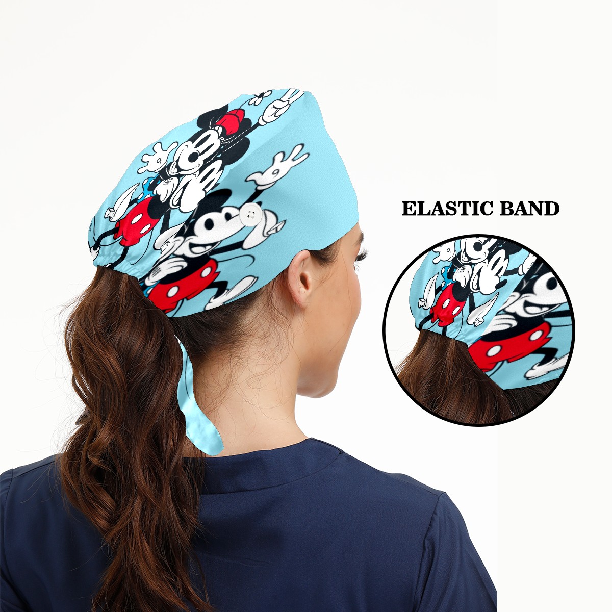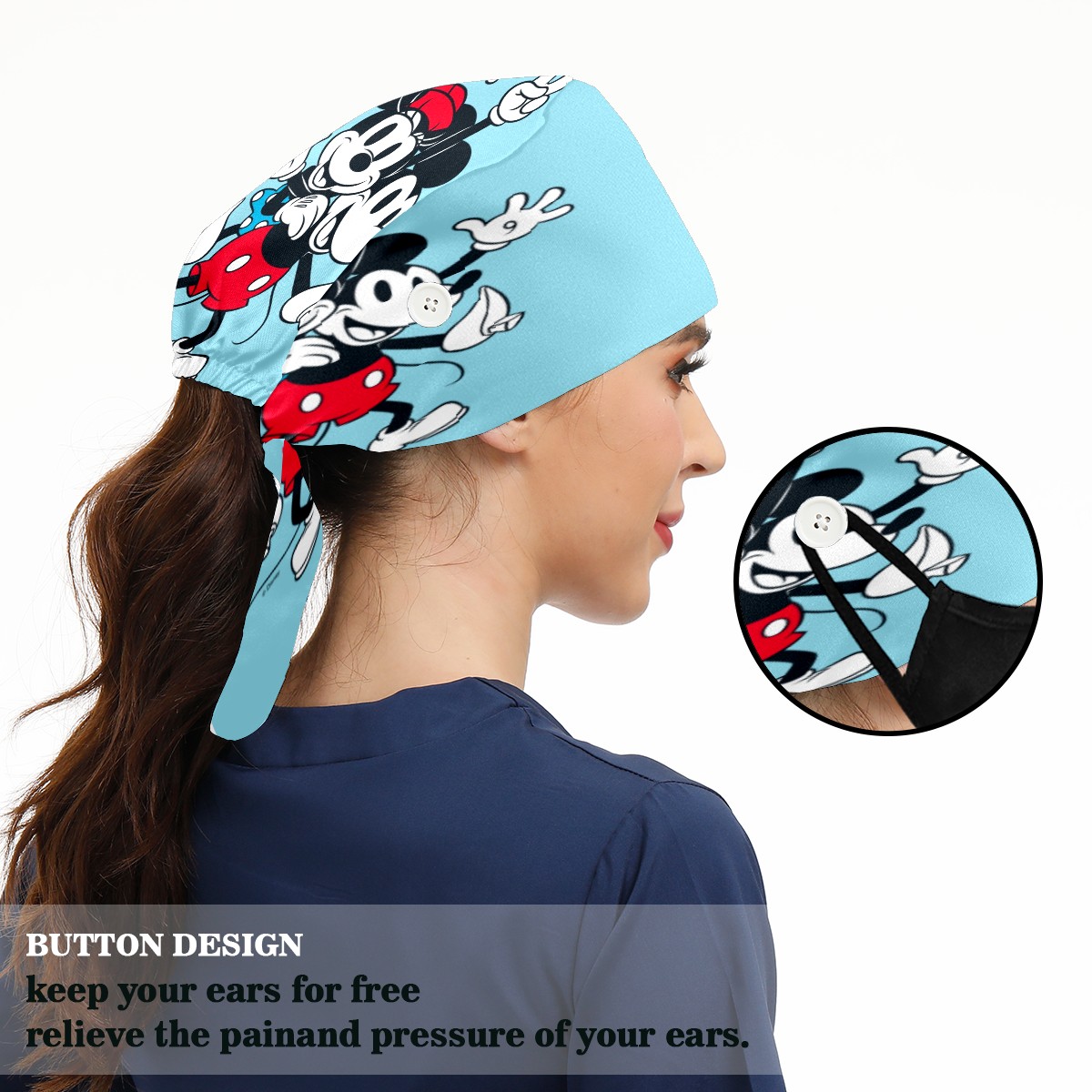 Fashion Working Cap Button and Sweatband Adjustable Elastic Blue Minnie Mickey Mouse Pattern Head Cover Hair Tie Back Work Hats for Women Men