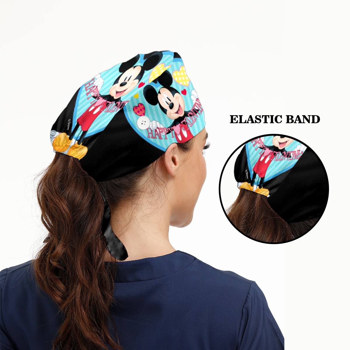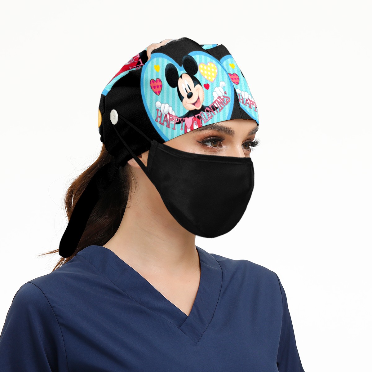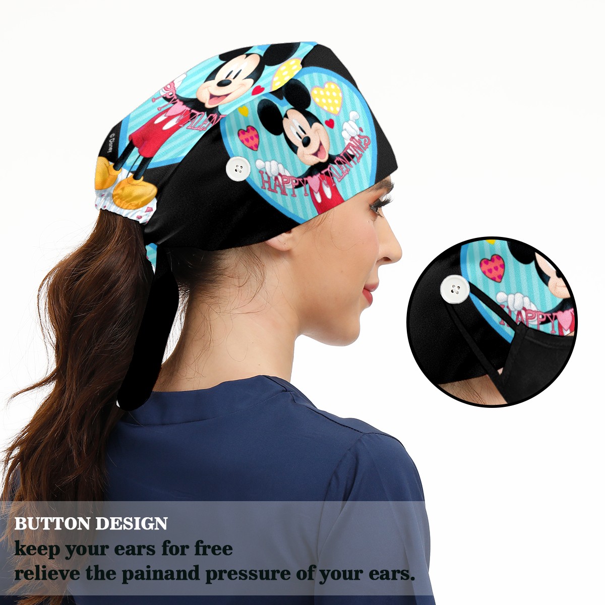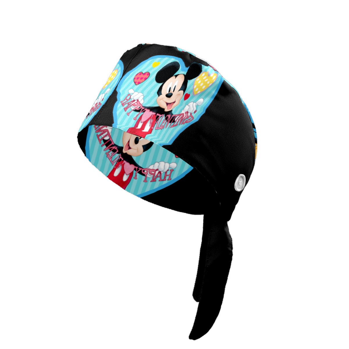Fashion Working Cap Button and Sweatband Adjustable Elastic Mickey Mouse Happy Valentines Day Black Head Cover Hair Tie Back Work Hats for Women Men