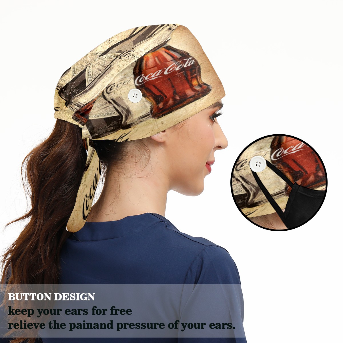 <p>Women and Mens head cover with Sweatband and Button</p><p>Material&nbsp;: 50% cotton+50% polyester</p><p>Size:&nbsp;One size fits most,&nbsp;suitable for both men and women.</p><p>Working Cap with Buttons Design:special&nbsp;design with buttons to protect ears for those who are wearing ma-sk. These new styles hats will allow you to put the straps around the buttons instead of your ears, make you feel more comfortable.</p><p>Sweat-absorbent towel cloth inside: Built-in&nbsp;100% cotton sweatband, keep the forehead clean after long time working.</p><p>Widely occasion: Widely used in beauty spa, house cleaning, cooking, sleeping, or for cos-play&nbsp;party.</p><p>Lovely pattern: lovely&nbsp;3D printed&nbsp;pattern,&nbsp;it's perfect for gift to you family&nbsp;and friends.</p>