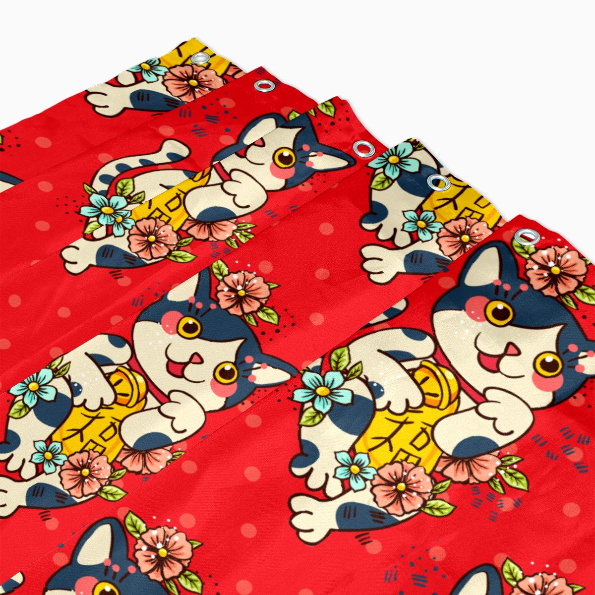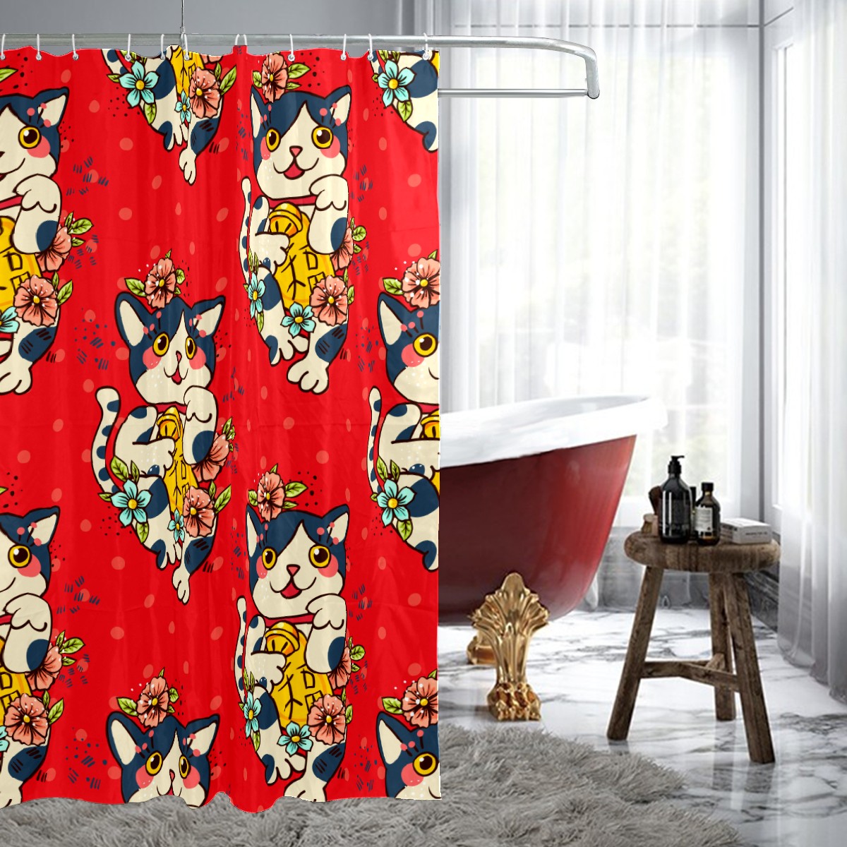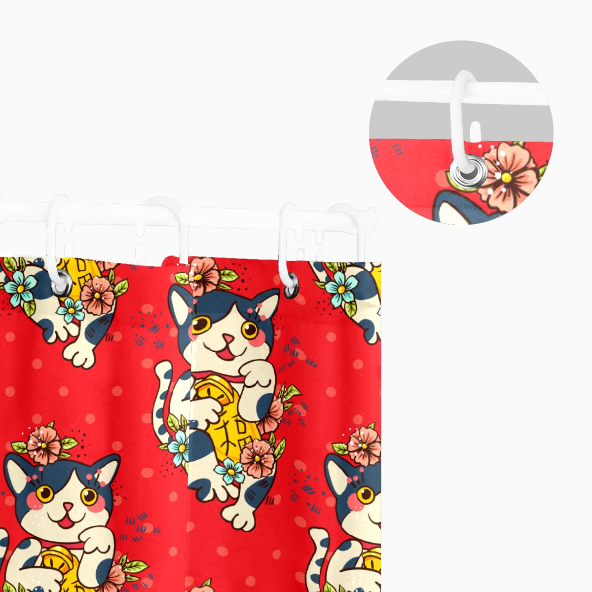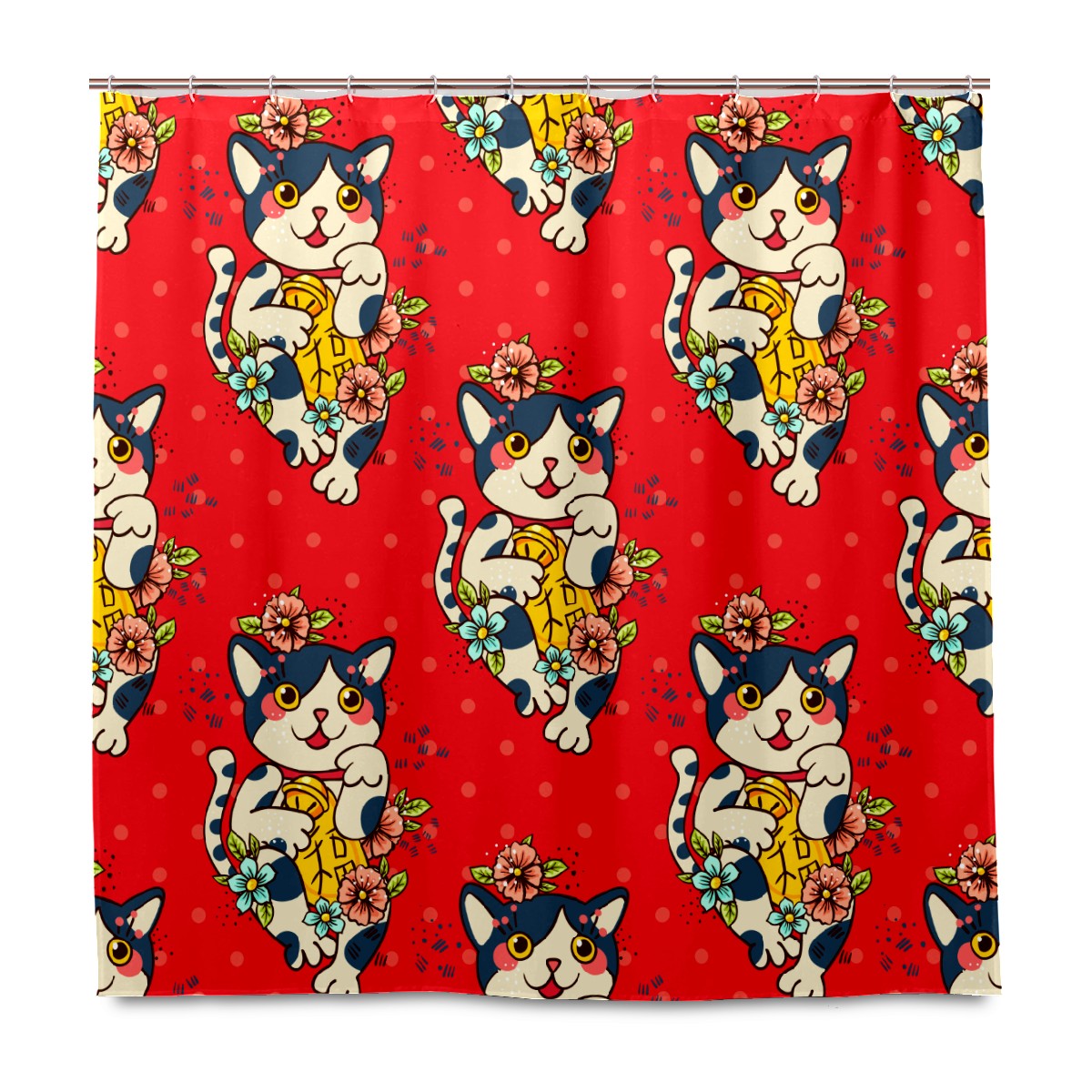 Shower Curtains for Bathroom Cartoon Japanese Lucky Cats Floral Pattern Waterproof Polyester Fabric 60 x 72 inches Decor Bathroom Curtains for Girls Boys with 12 Hooks