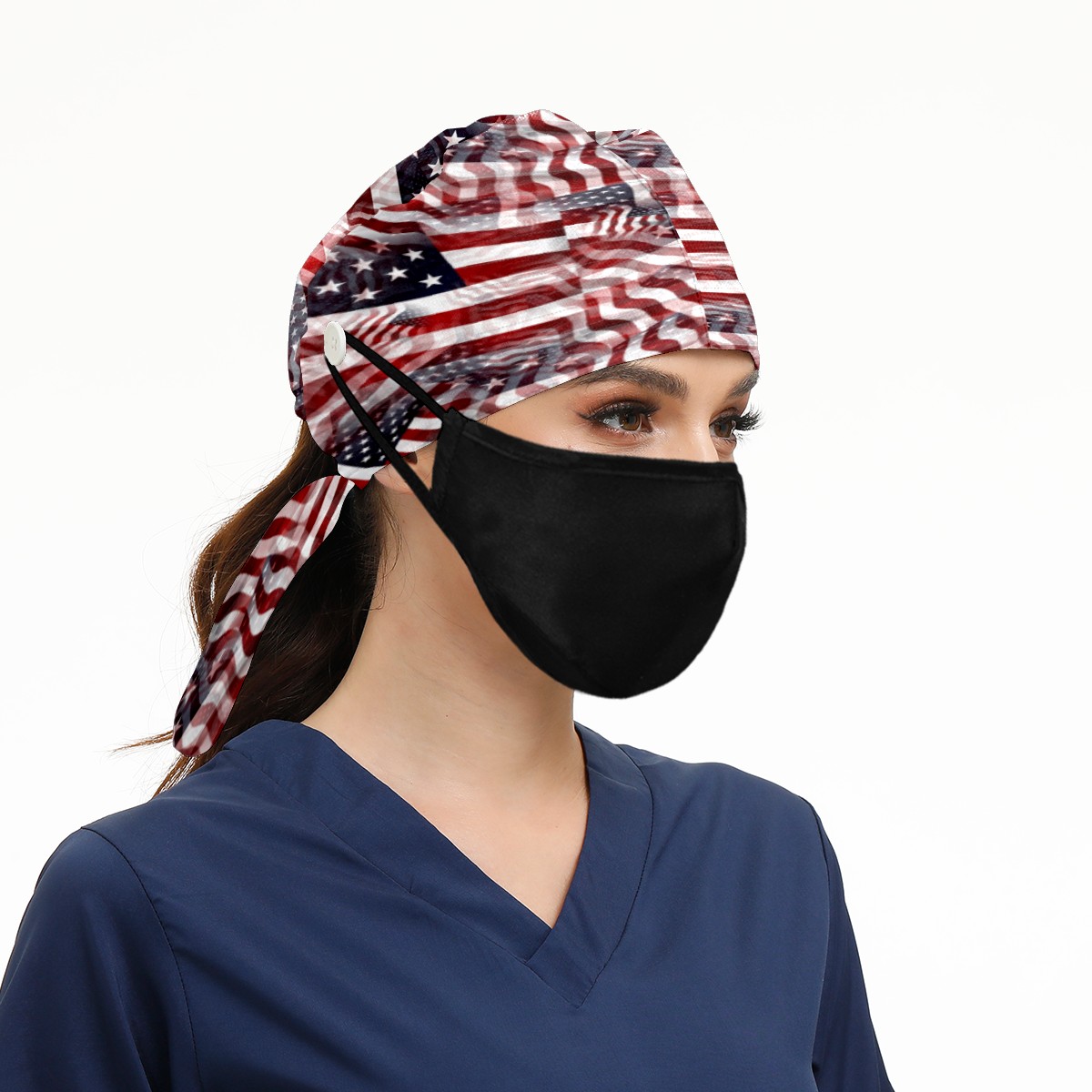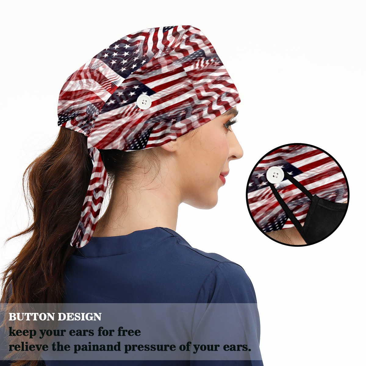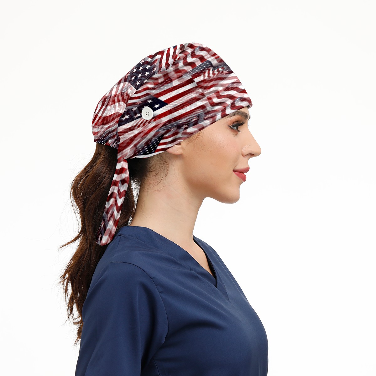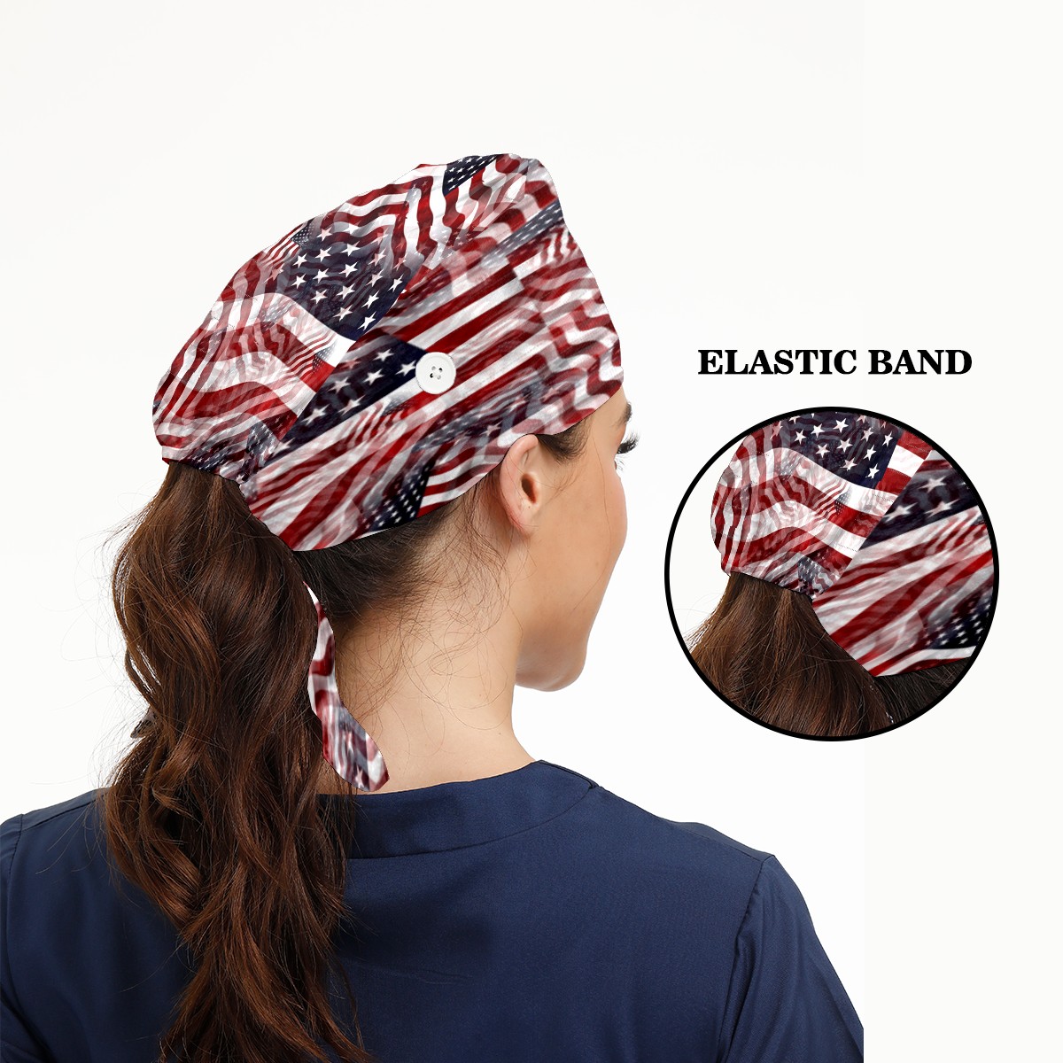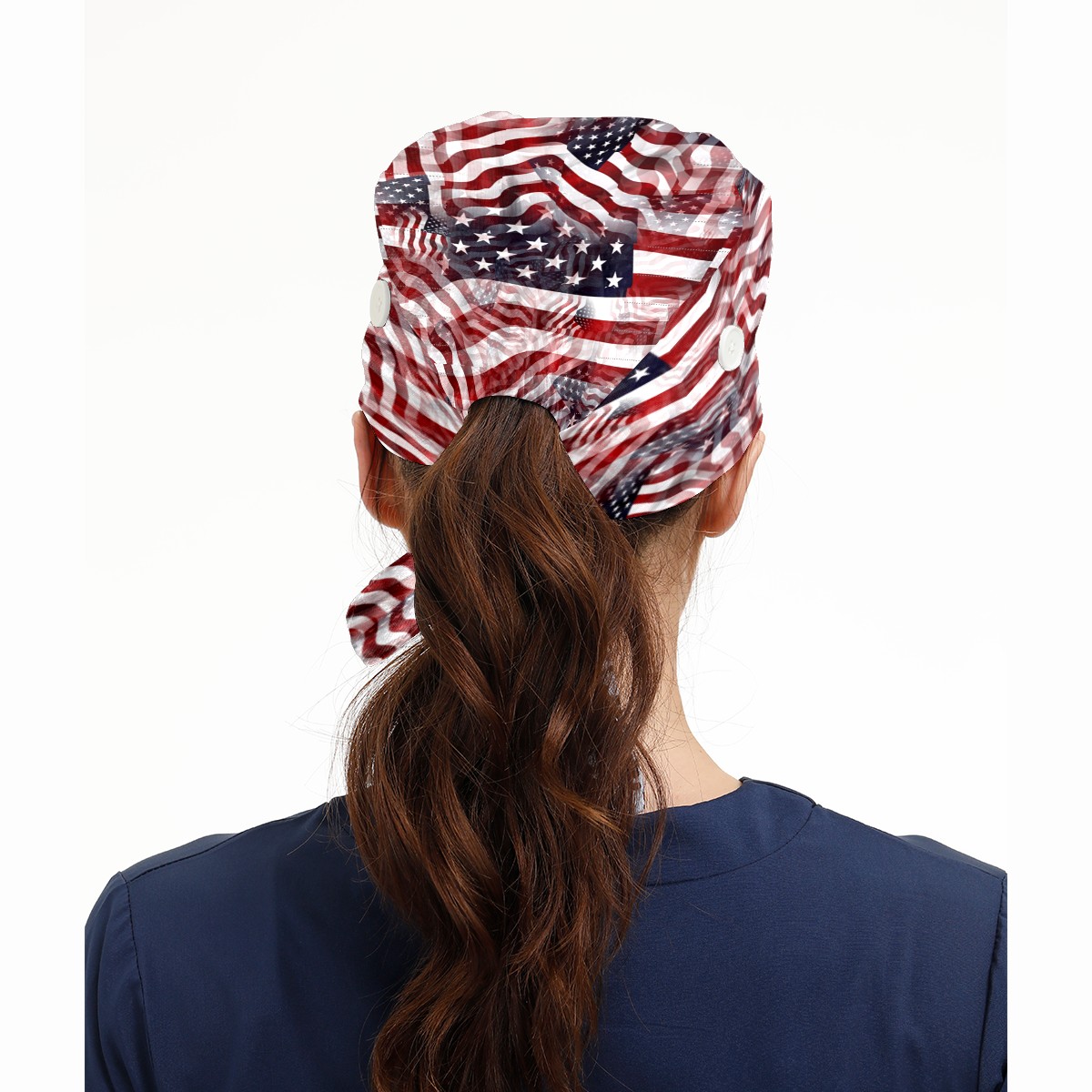 One Size Working Cap for Women Men Sweatband Adjustable Tie Back Printed Headwear American Flag Red White Blue Stripe