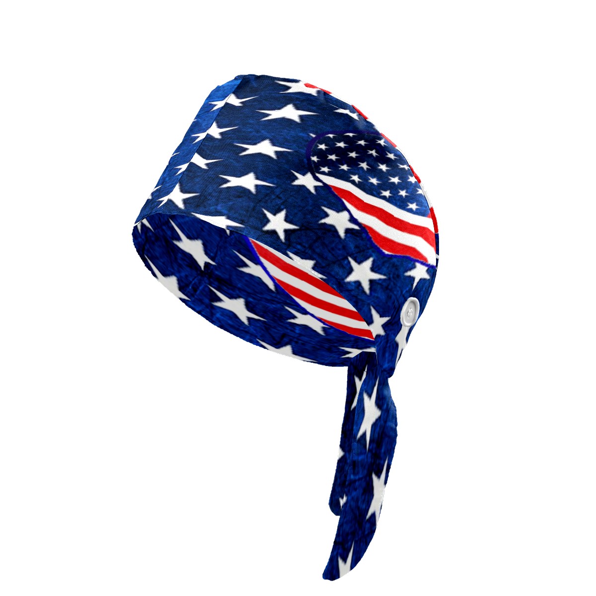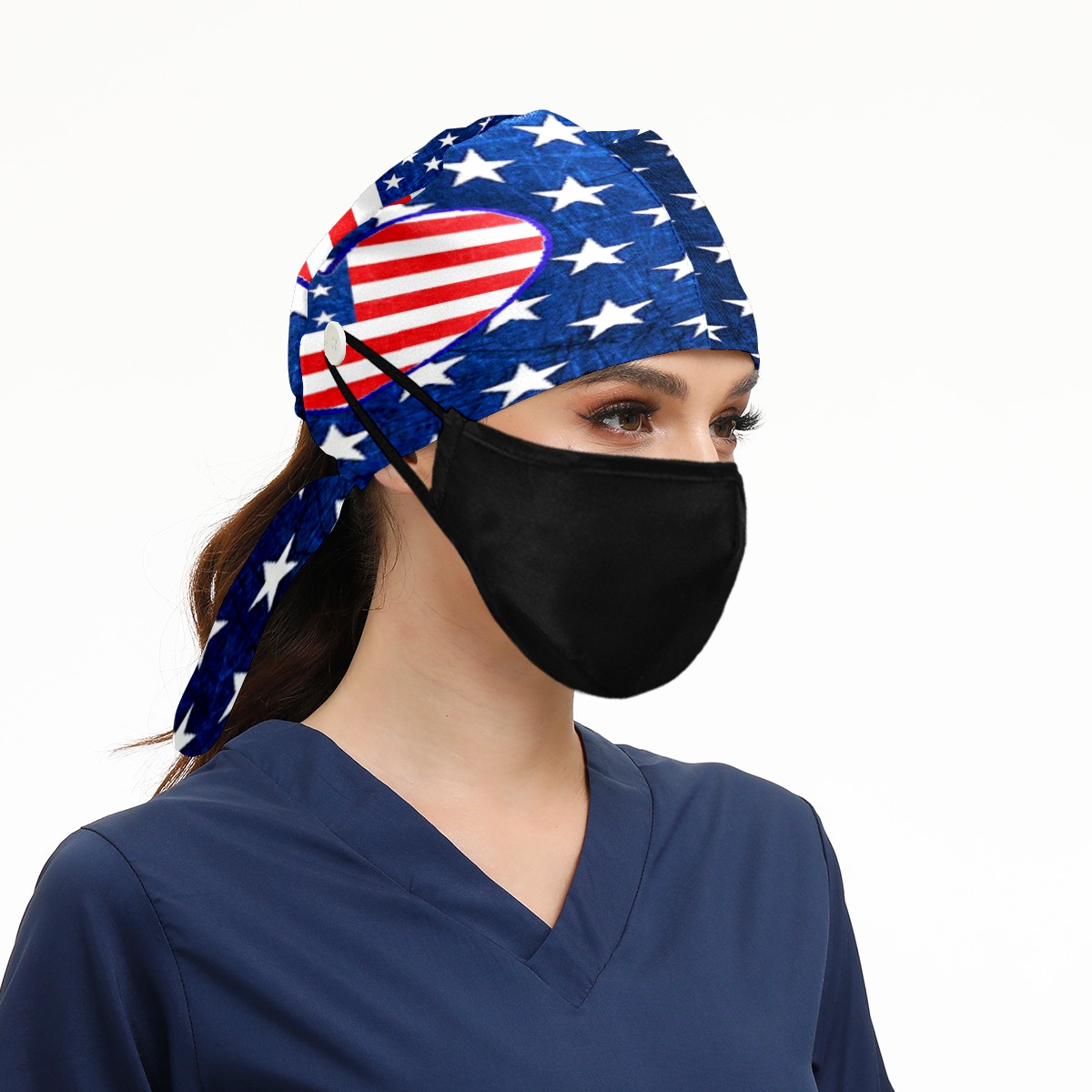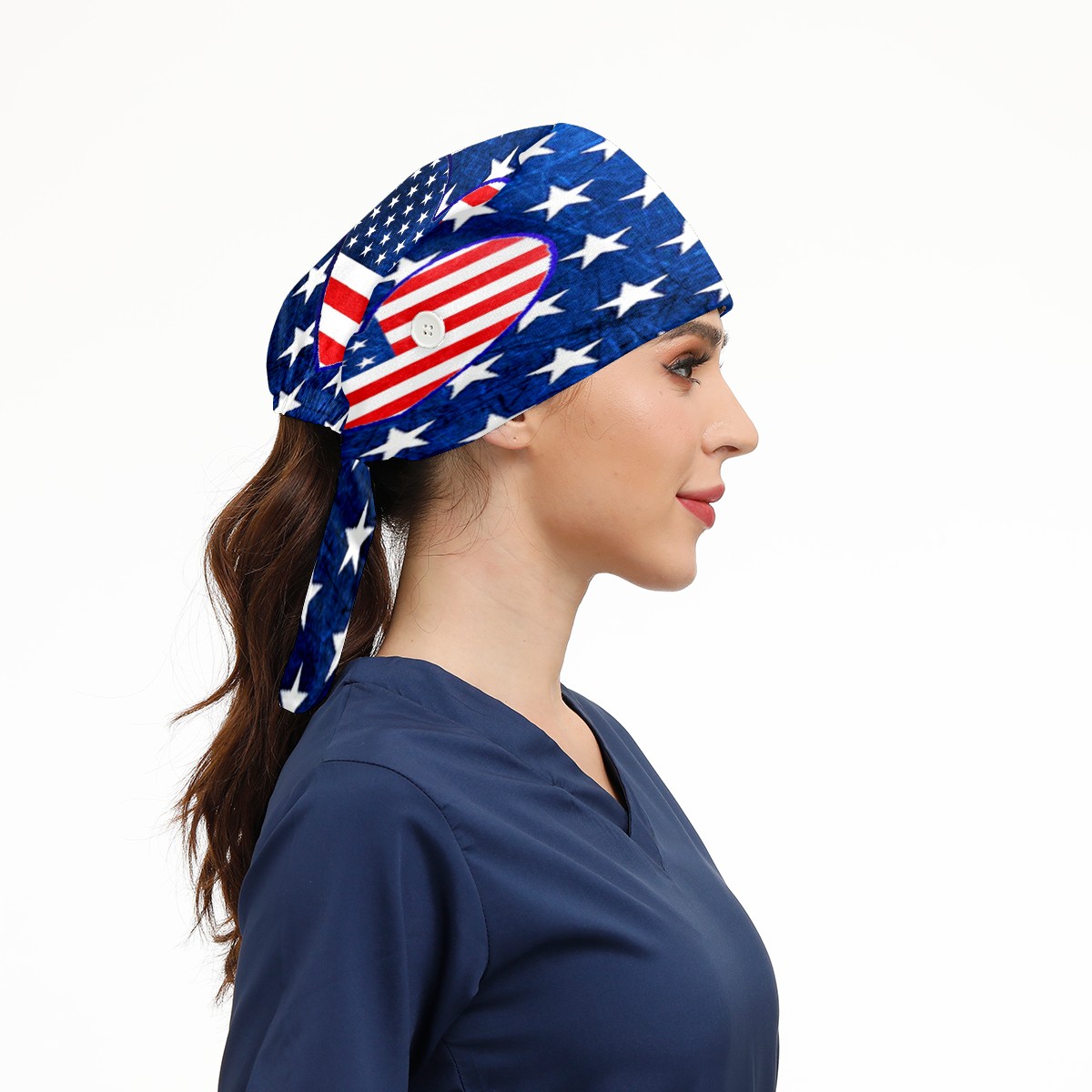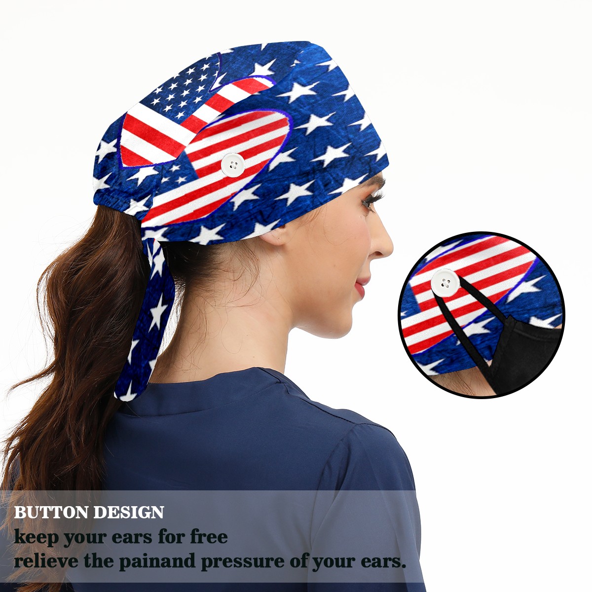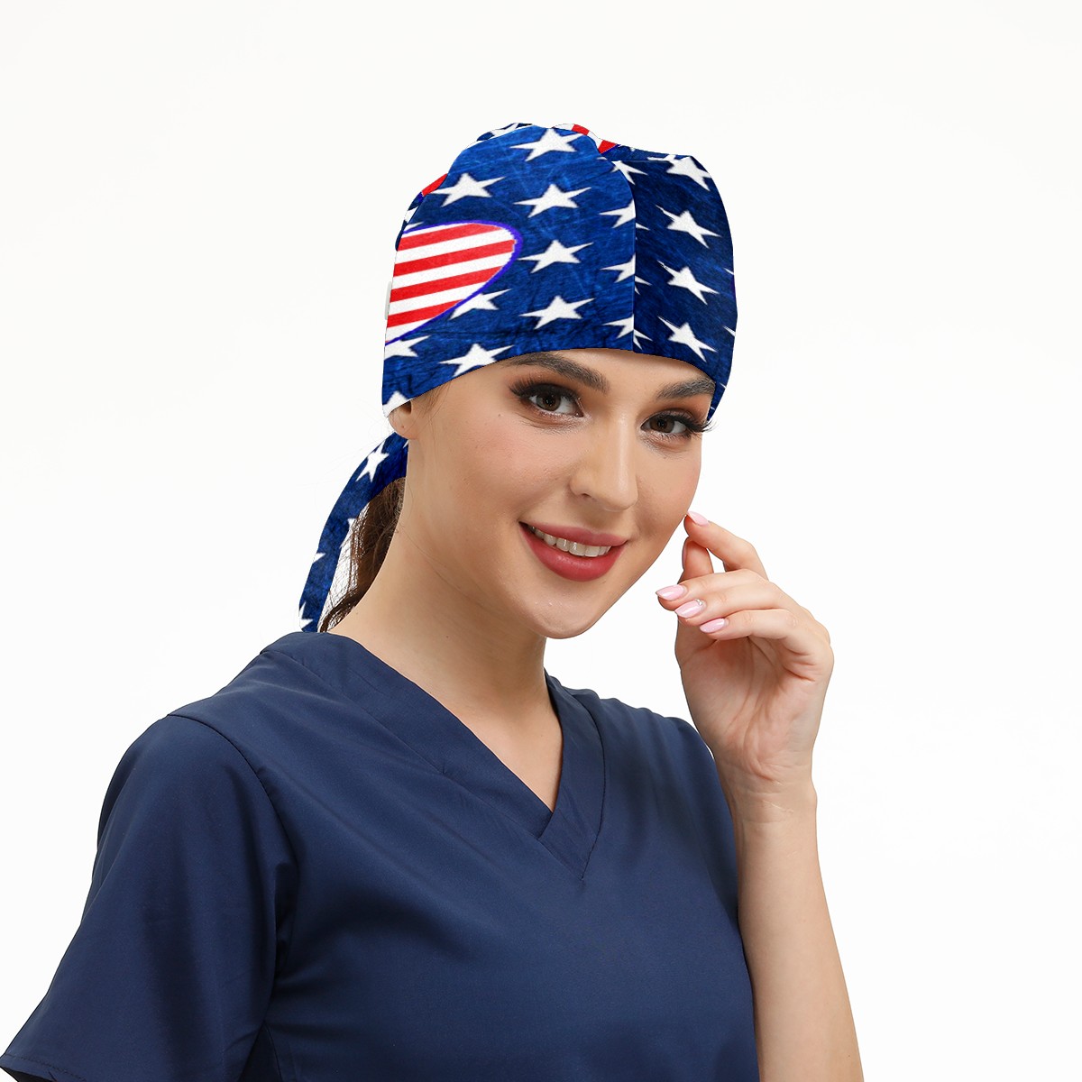 One Size Working Cap for Women Men Sweatband Adjustable Tie Back Printed Headwear American Flag Heart Red White Blue
