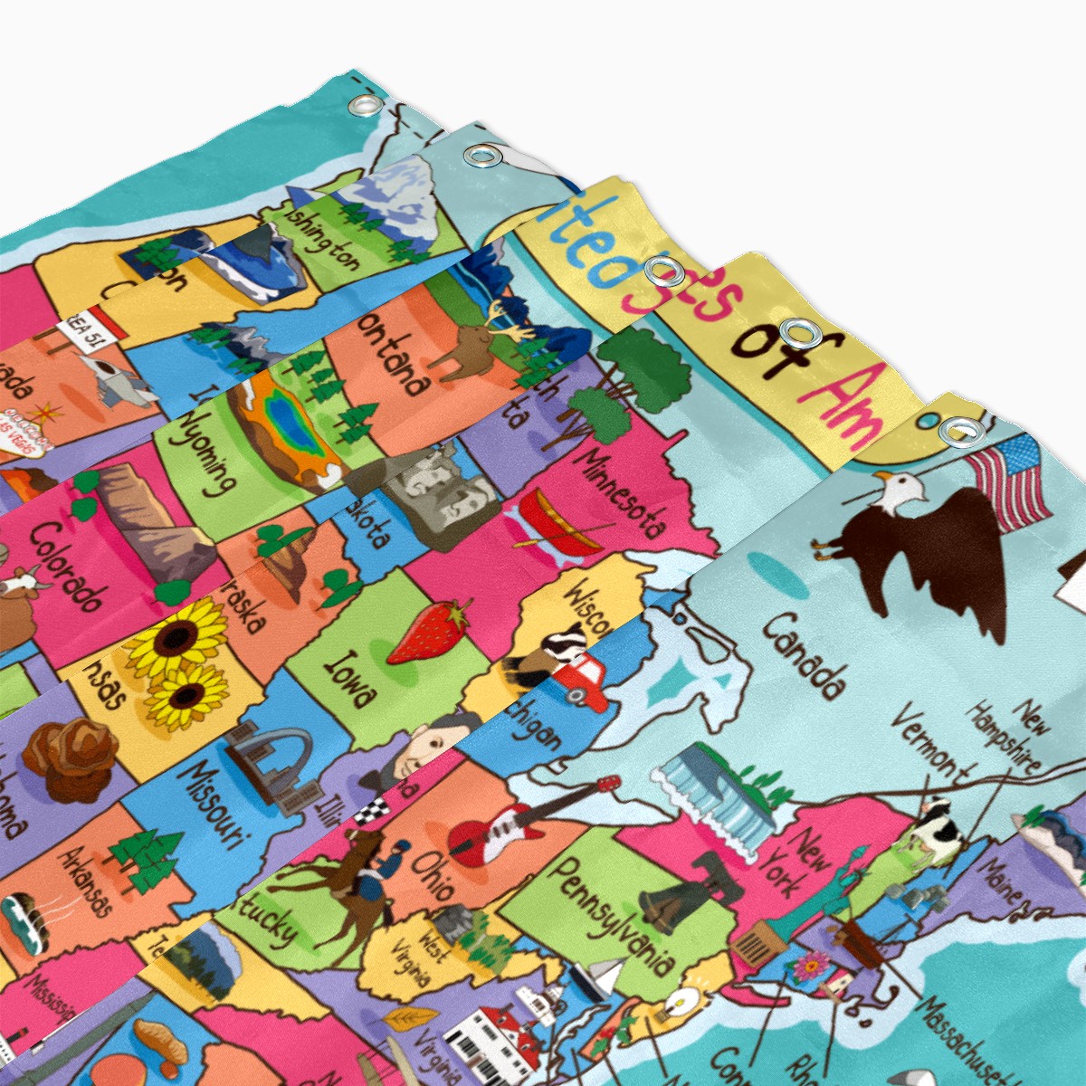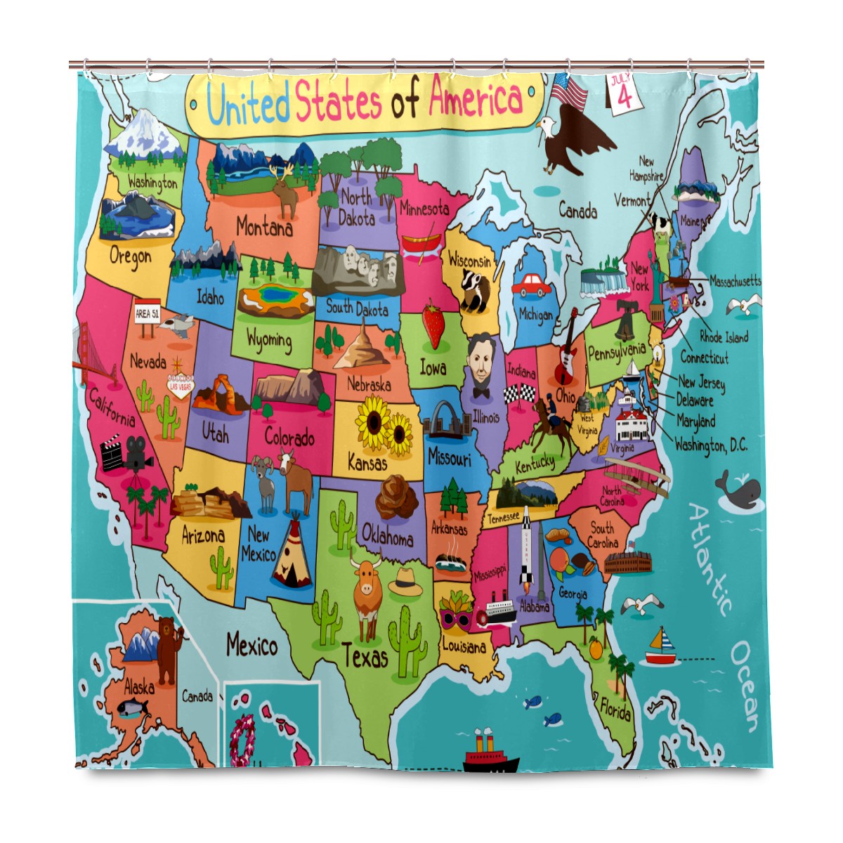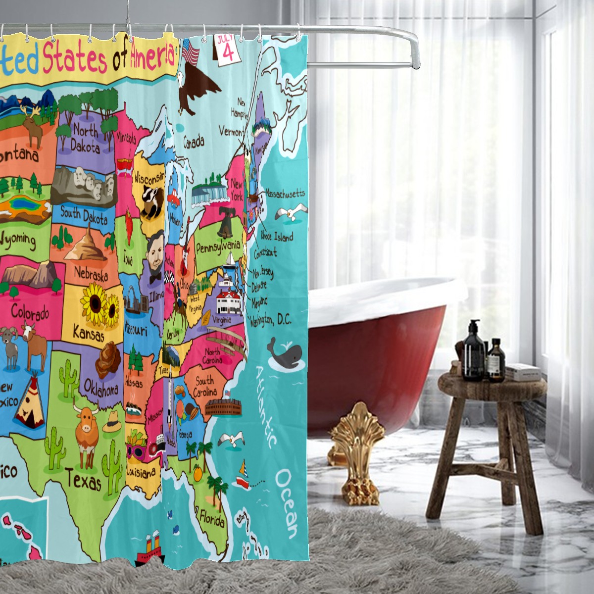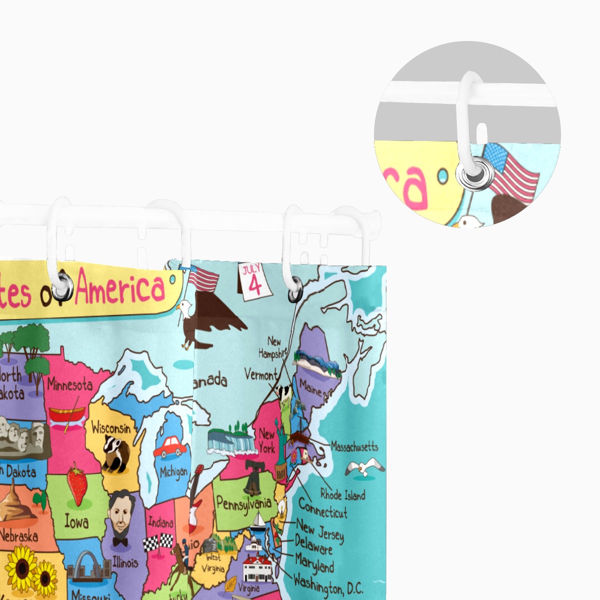 Shower Curtains for Bathroom Colorful Funny Cartoon America Map Waterproof Polyester 60 x 72 inches Bathroom Curtains for Girls Boys with 12 Hooks