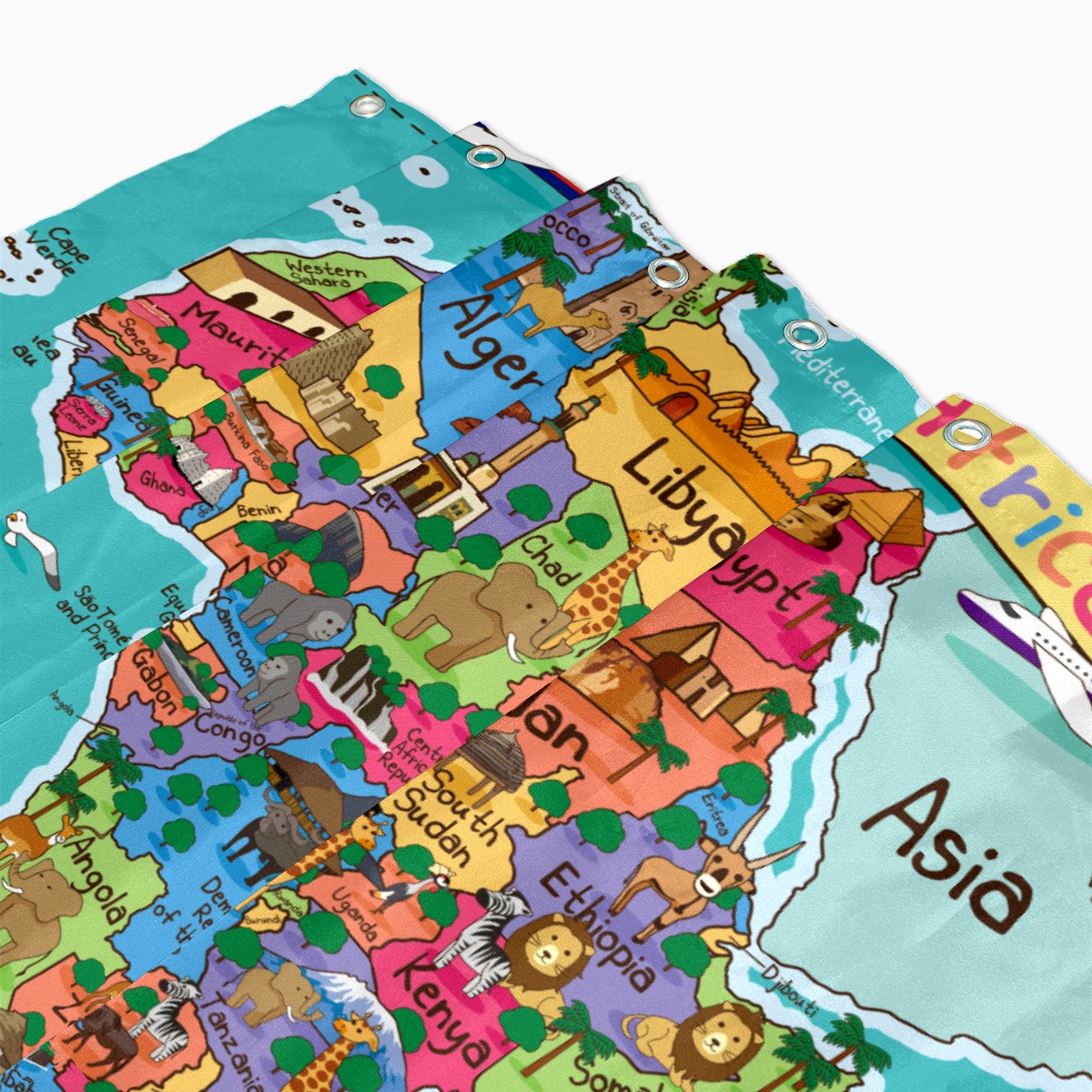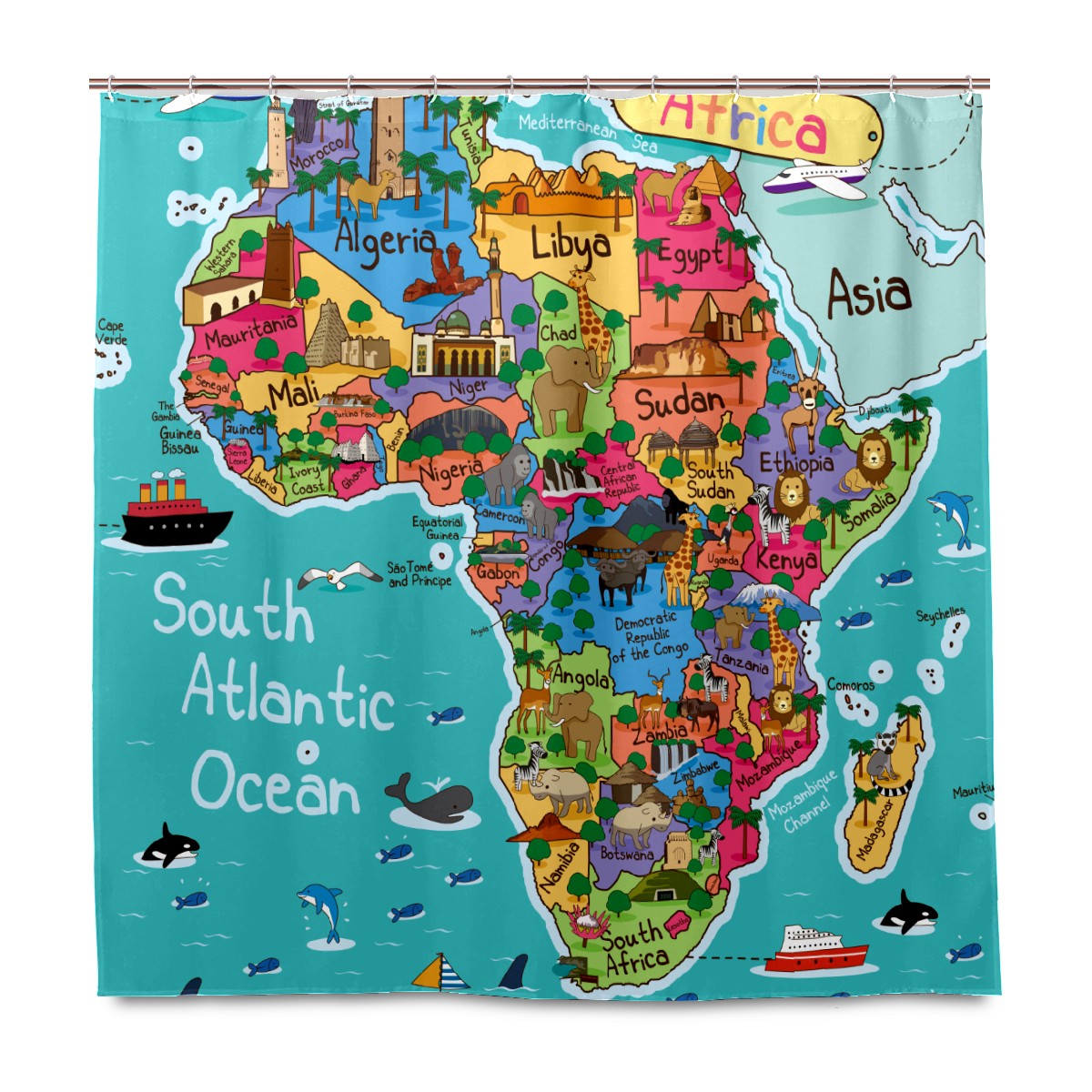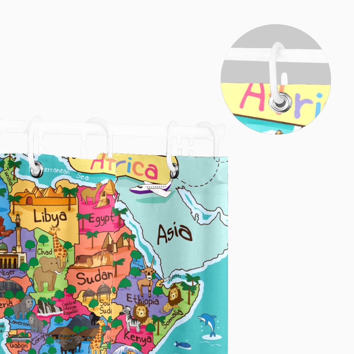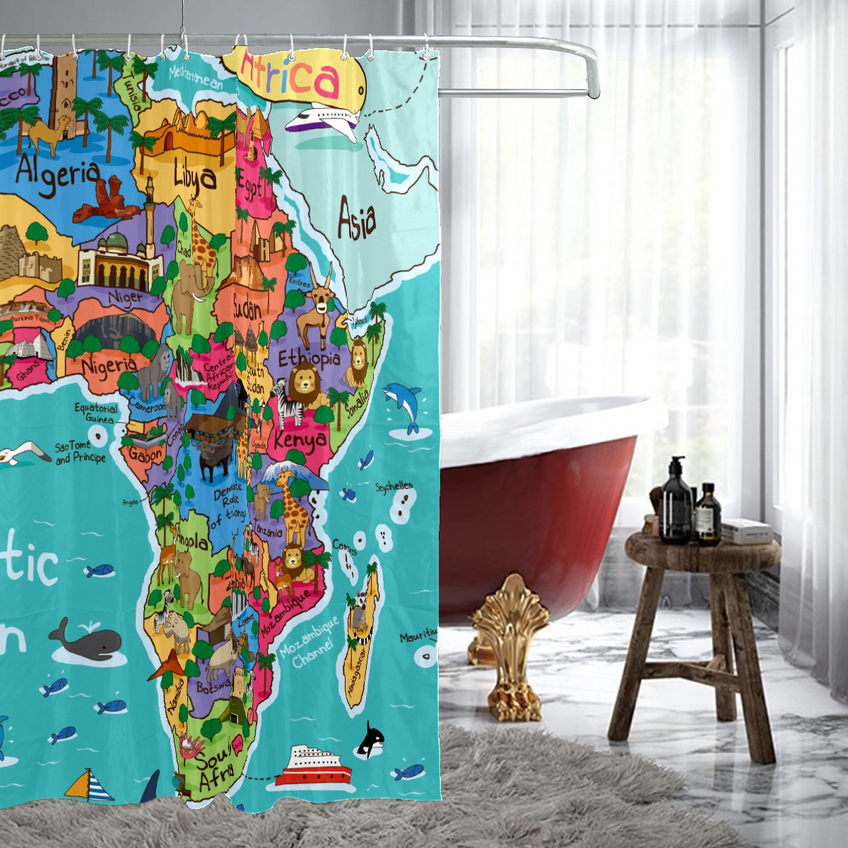 Shower Curtains for Bathroom Cartoon Animal World Map Waterproof Polyester 60 x 72 inches Bathroom Curtains for Girls Boys with 12 Hooks