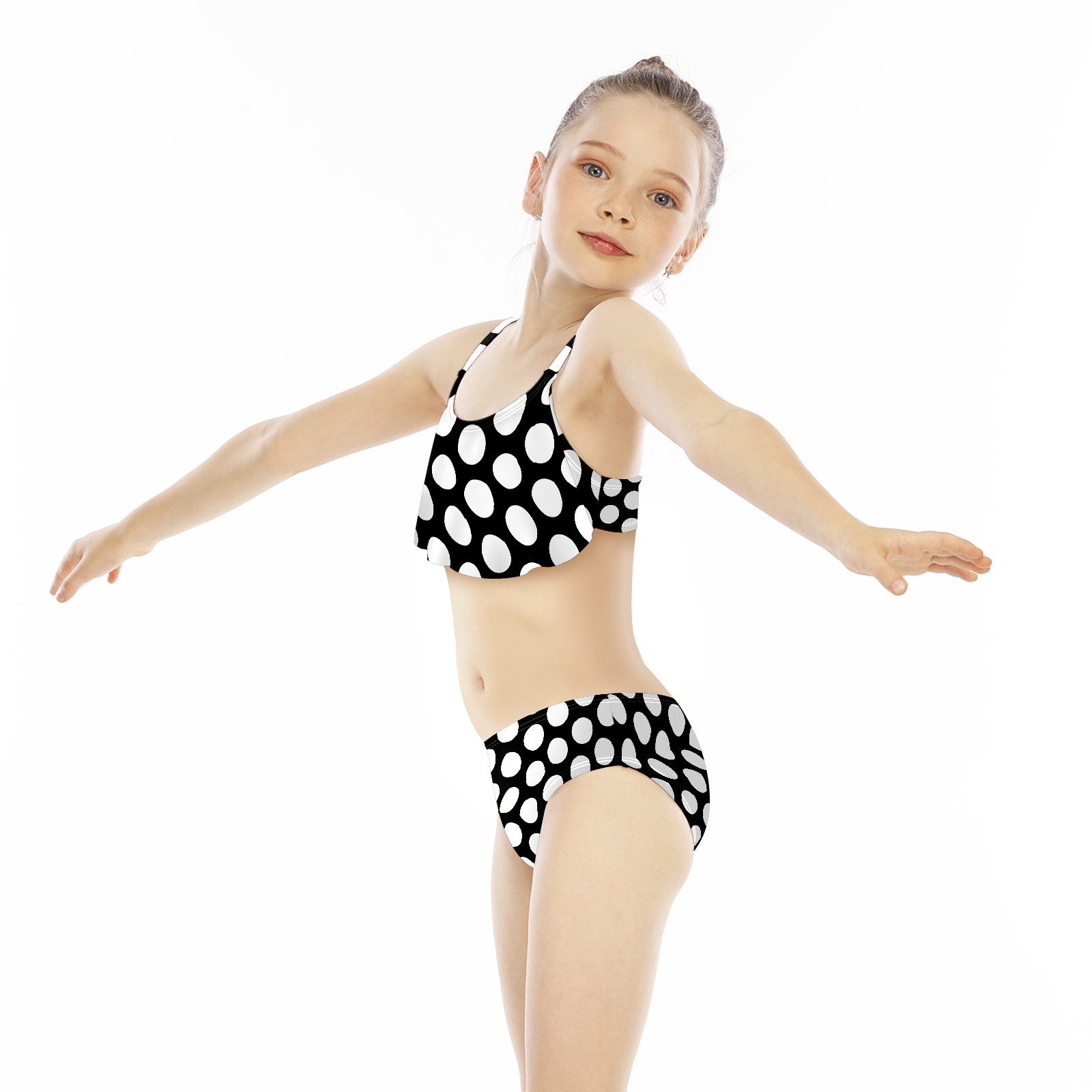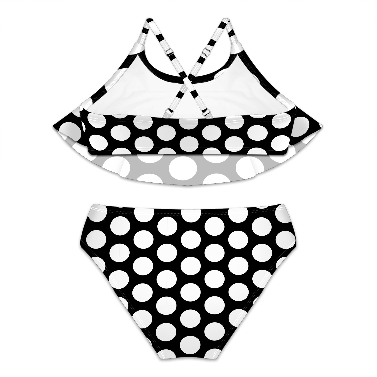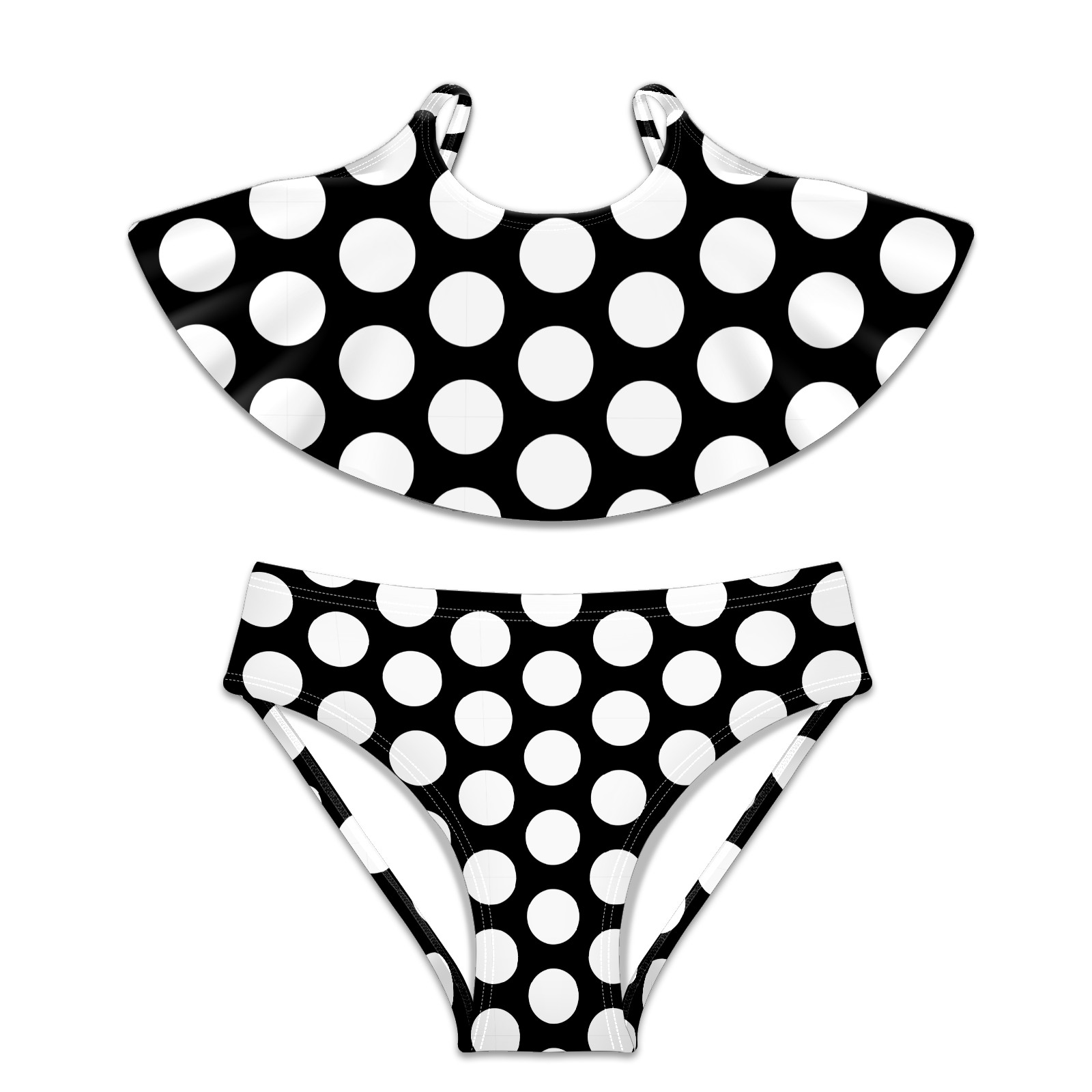 Girls Swimsuits Two Piece Bikini Set Big White Polka Dot On Black Ruffle Beach Swimwear Summer Bathing Suit