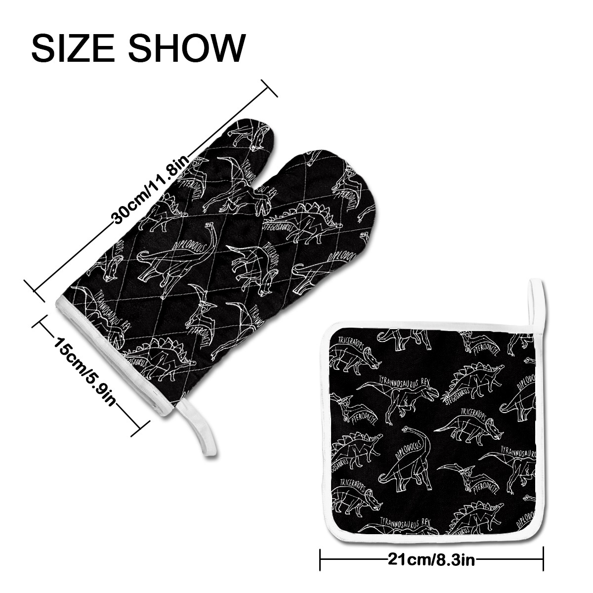 <p><b>Funny Oven Mitts and Pot Holders Sets 480 F Non-Slip Oven Gloves for Kitchen Cooking Baking Grilling Microwave&nbsp;</b></p><p><b>Size:</b>1 oven mitt (11.8 in x5.9 in) and 1 pot holders (8.3 in x 8.3 in)</p><p><b>Material: </b>polyster + cottoon</p><p><b>Features:</b></p><p>-Customized cute&nbsp;thicker oven mitts,&nbsp;temperature up to 480℉/250℃, which will effectively protect your hands from burns. It’s perfect for a Thanksgiving Day/Christmas gift and is the best choice for baking lovers.</p><p>-Each oven mitt is equipped with a hanging loop for easy storage. Non slip neoprene grip allows you to grab hot pots, pans, and cookie sheets with</p><p>confidence</p><p>-Oven Mitts and pot holders are machine washable &amp; dryer safe. Cotton lining reinforced so padding won't come out after washing. Silicone oven gloves can be cleaned in dishwasher or rinsed with water</p><p>-If you aren't satisfied for any reason with your pot holder, please reach out to us directly so we can take care of you.</p><p><b>Package Including:</b></p><p>1 Gloves</p><p>1 Pot Holders</p>